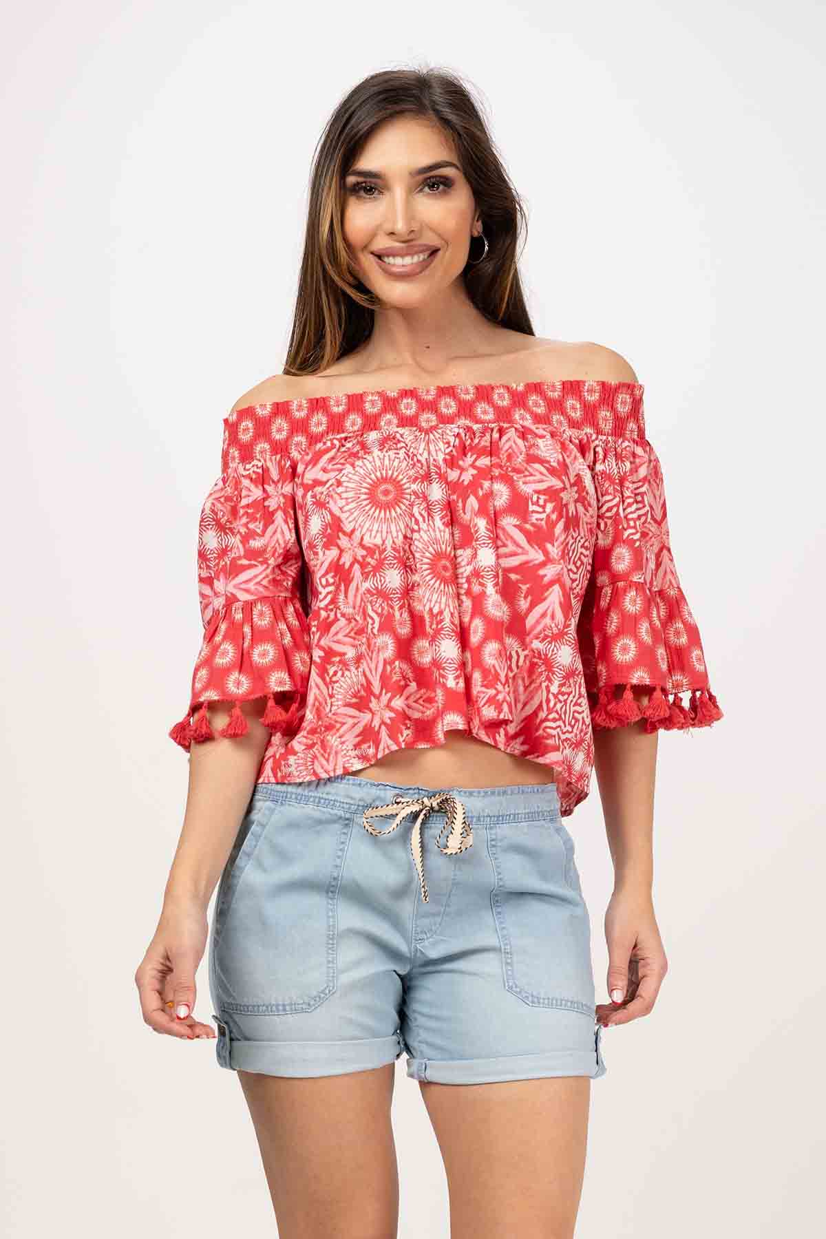 BLUSA CORTA CON CUELLO DE GOMAS ELASTICAS MANGA 3/4 TERMINADA EN VOLANTE CON POMPONES 100% ALGODÓN