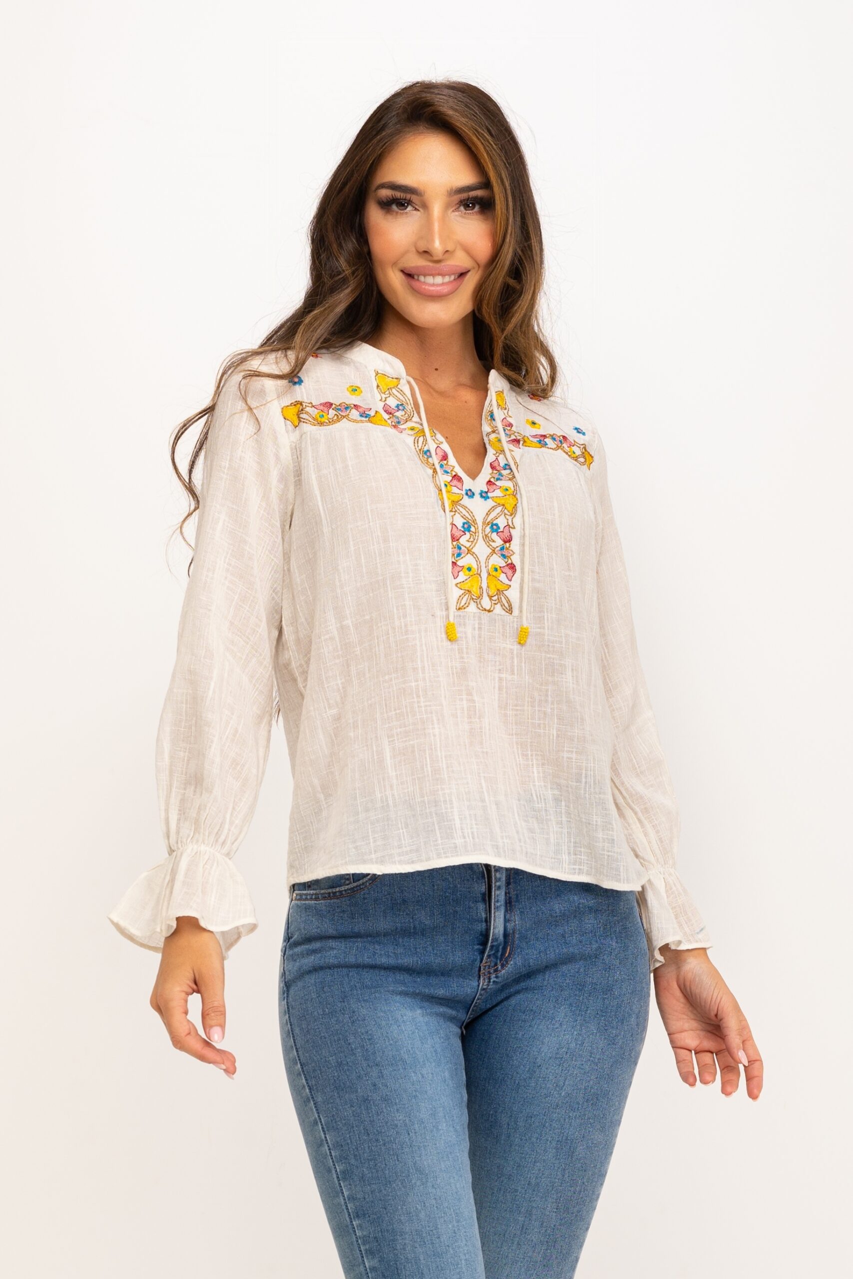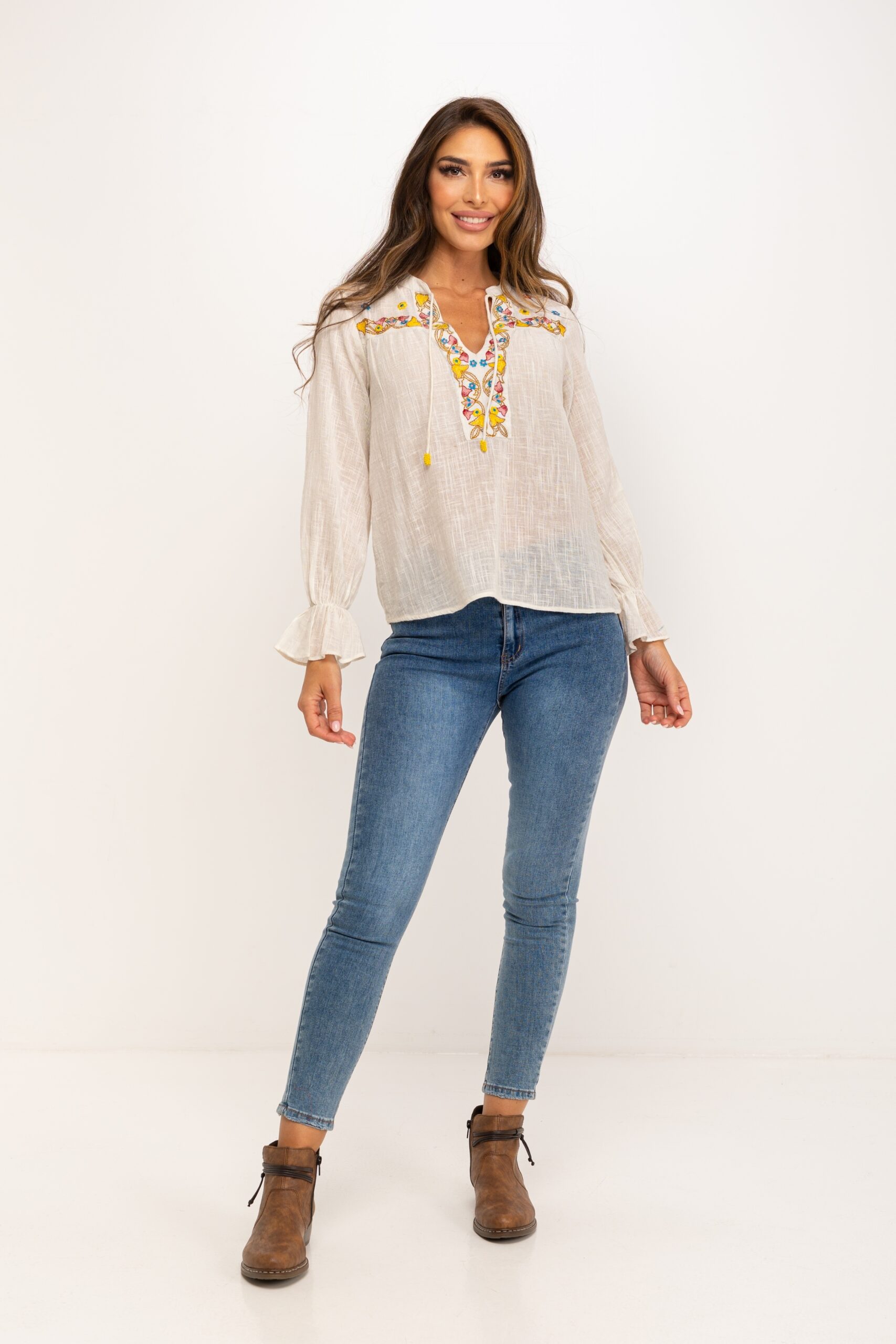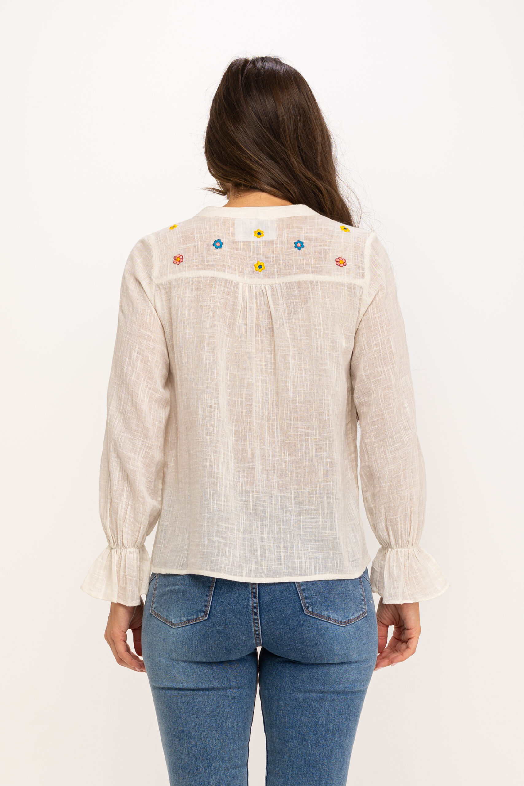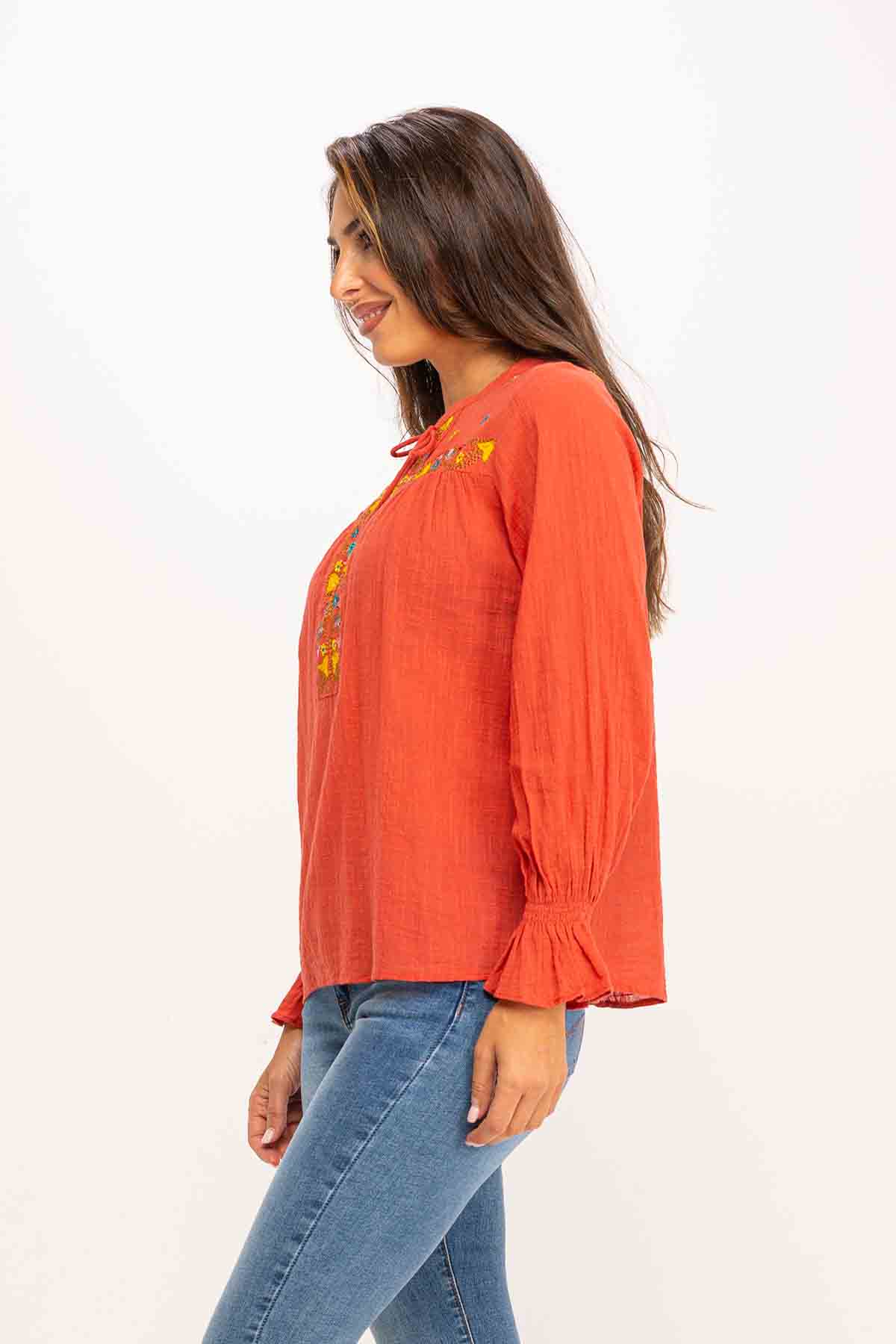 BLUSA DE ALGODÓN RUSTICO CUELLO MAO Y BORDADOS