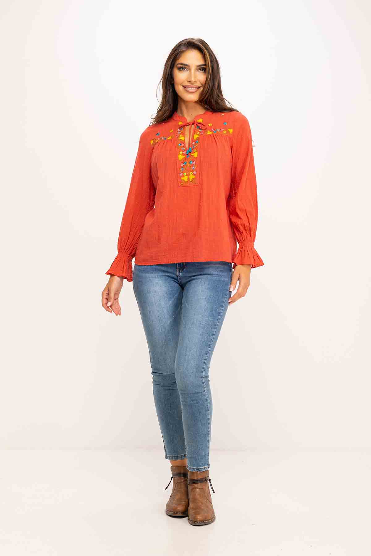 RUSTIC COTTON BLOUSE MAO COLLAR AND EMBROIDERY 100%ALGODON