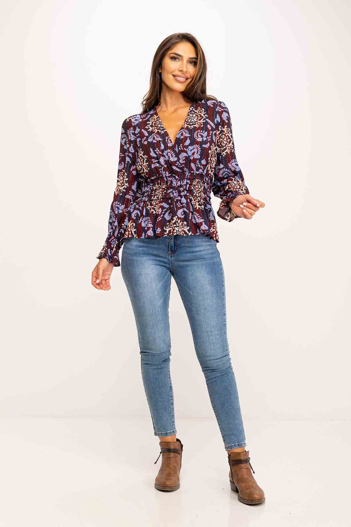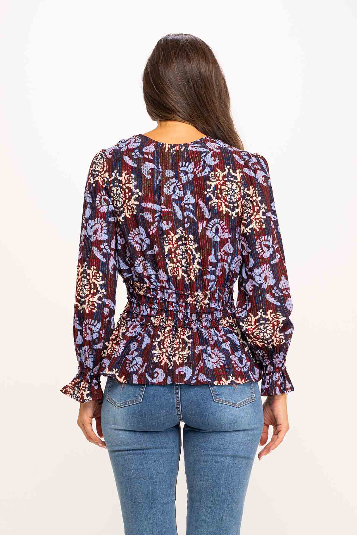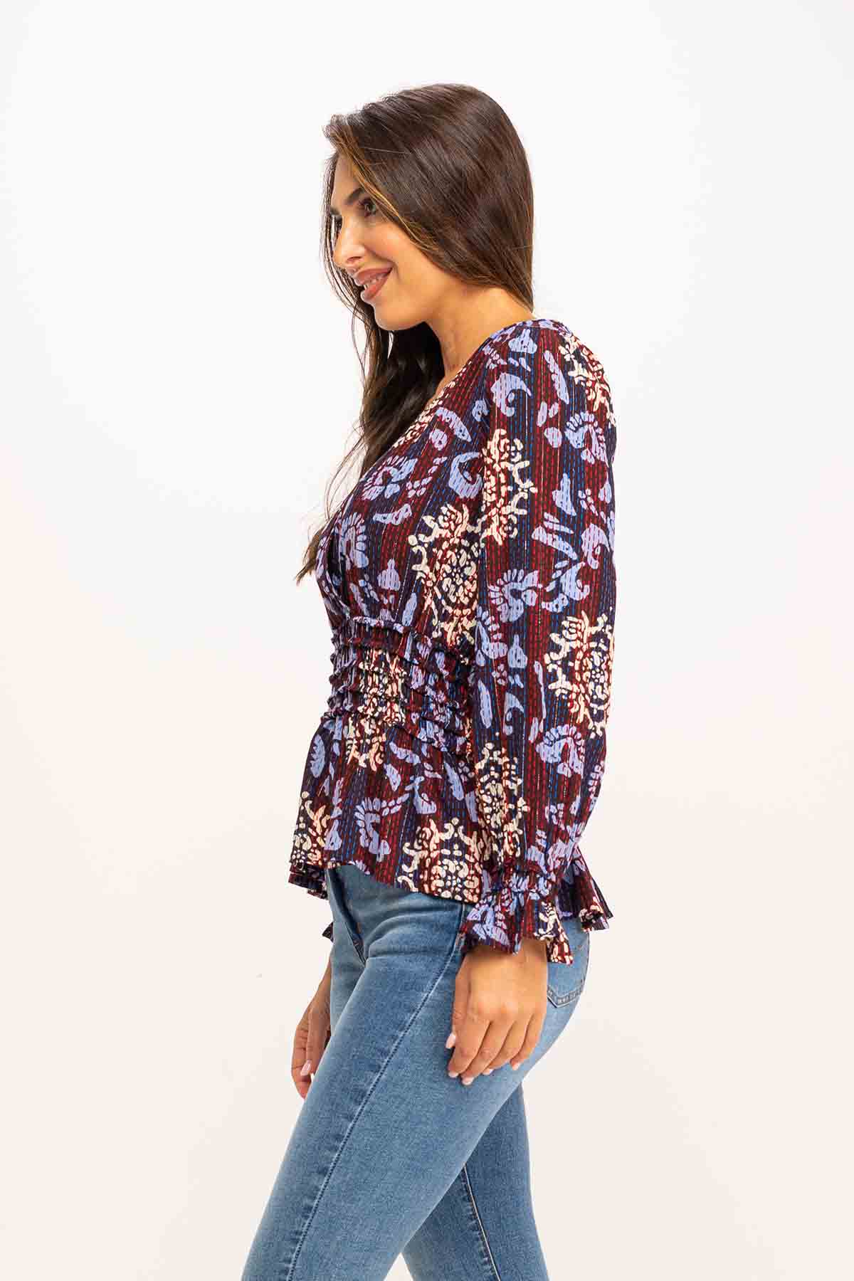 BLUSA ESTAMPADA LUREX CUELLO CRUZADO Y ELASTICO EN CINTURA