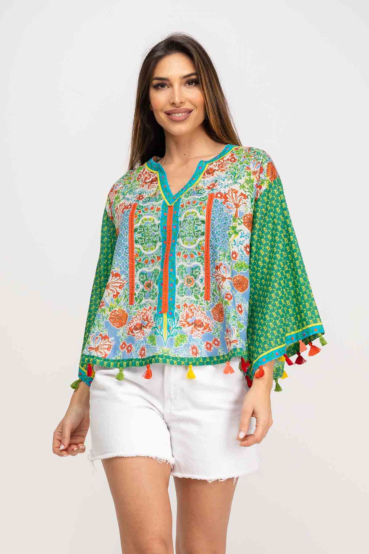 BLUSA ESTAMPADA CON CUELLO CAJA Y ACABADO EN V AL CENTRO, MANGAS 3/4, CINTAS DE LACE EN EL FRONTAS Y POMPONES EN BOCAMANGAS Y BAJO