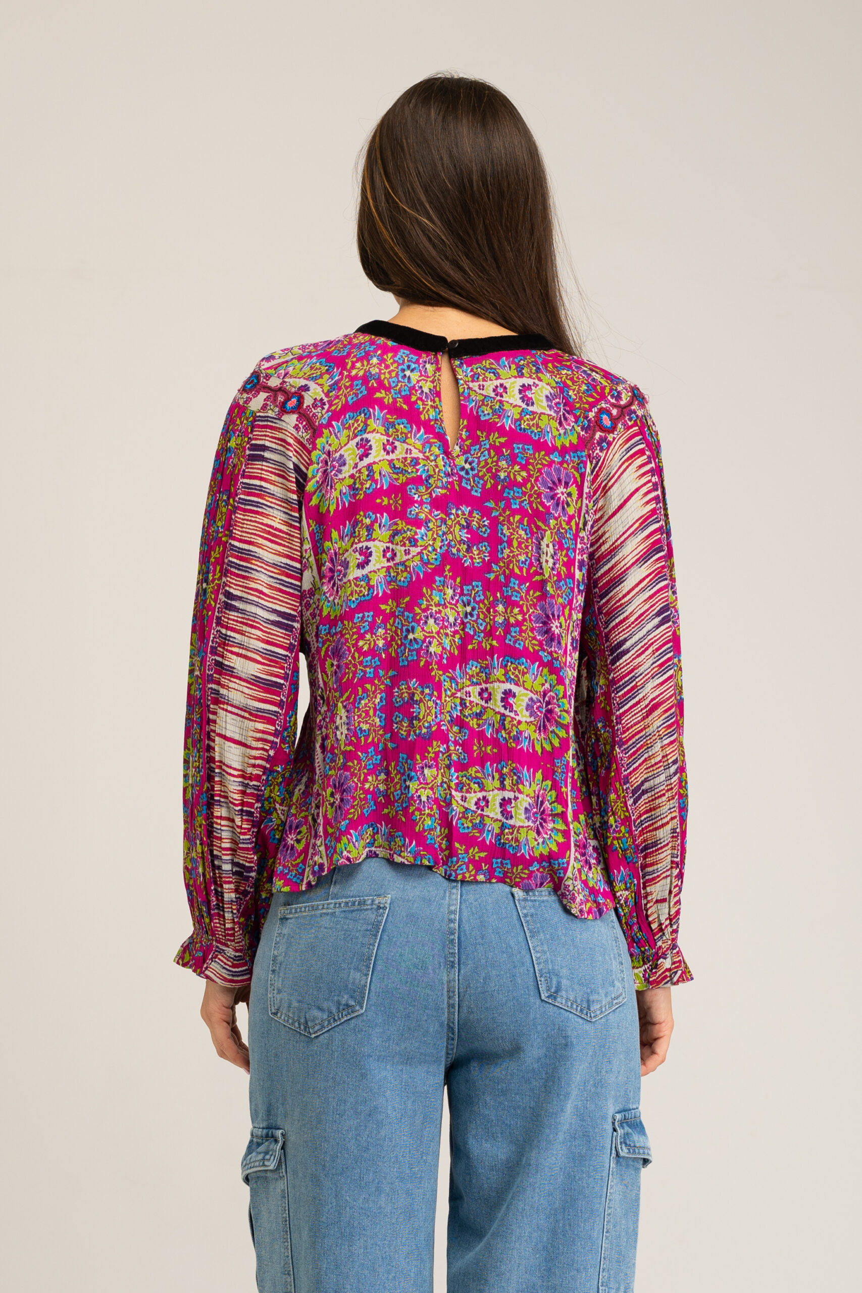 BLUSA ESTAMPADA VISCOSA CUELLO TERCIPELO Y BORDADOS