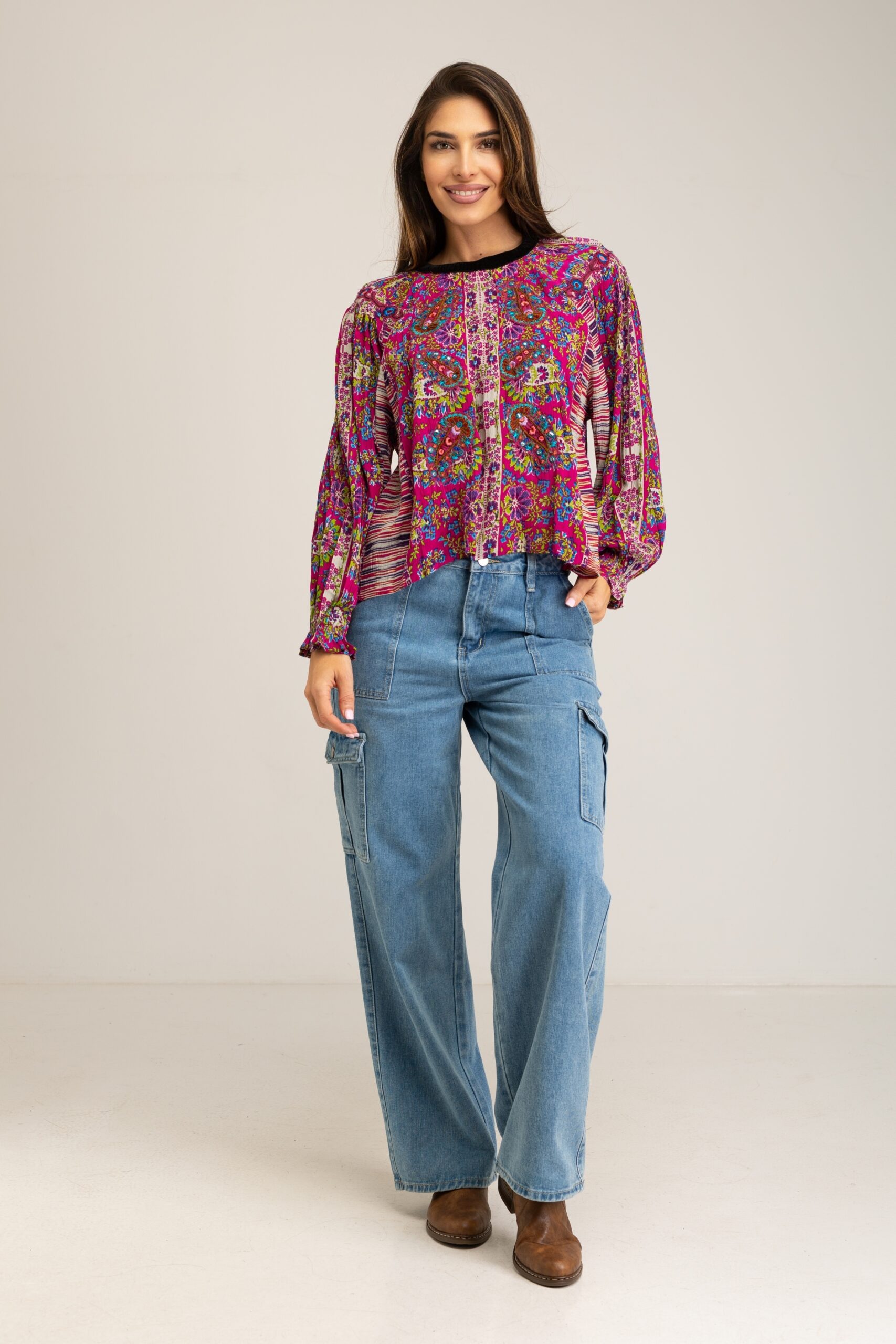 PRINTED EMBROIDERY BLOUSE ROUNDED COLLAR WITH VELVET 100%VISCOSA