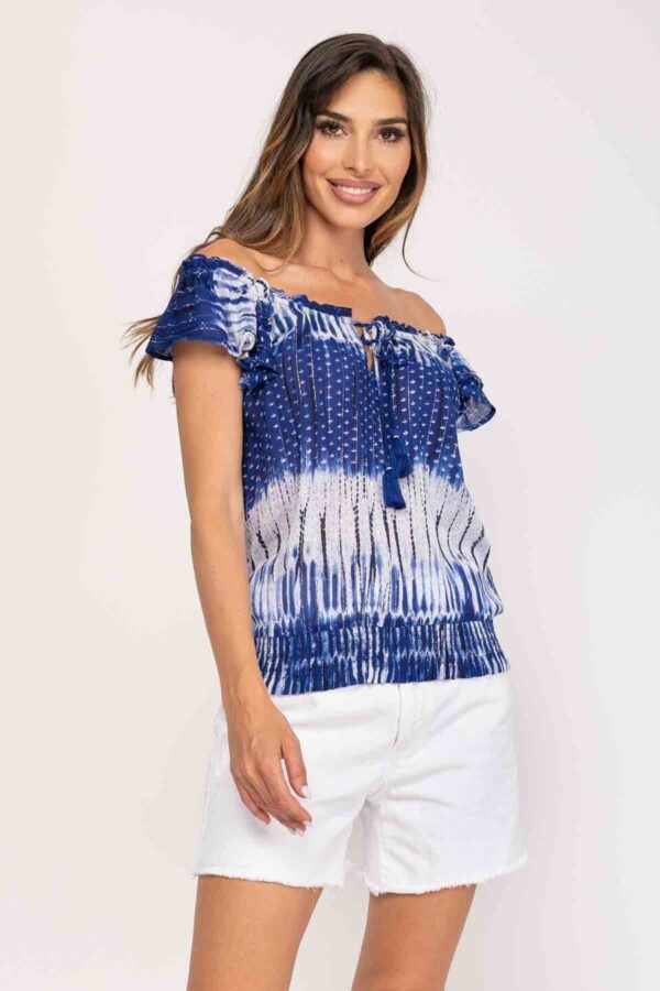 BLUSA TYE DYE, ESCOTE CON ELASTICO PARA PODER PONER SOBRE LOS HOMBROS O EN PALABRA DE HONOR, CUELLO CON GOTA Y CORDON PARA AJUSTAR, BAJO CON ELASTICO. 98% VISCOSA 2% METALICO