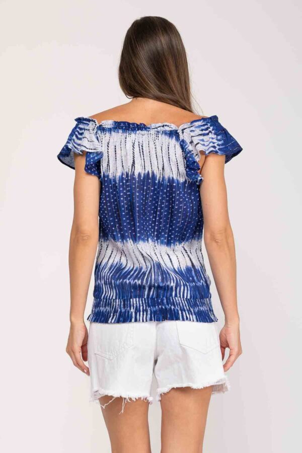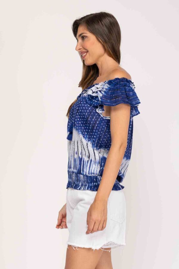 BLUSA TYE DYE, ESCOTE CON ELASTICO PARA PODER PONER SOBRE LOS HOMBROS O EN PALABRA DE HONOR, CUELLO CON GOTA Y CORDON PARA AJUSTAR, BAJO CON ELASTICO.