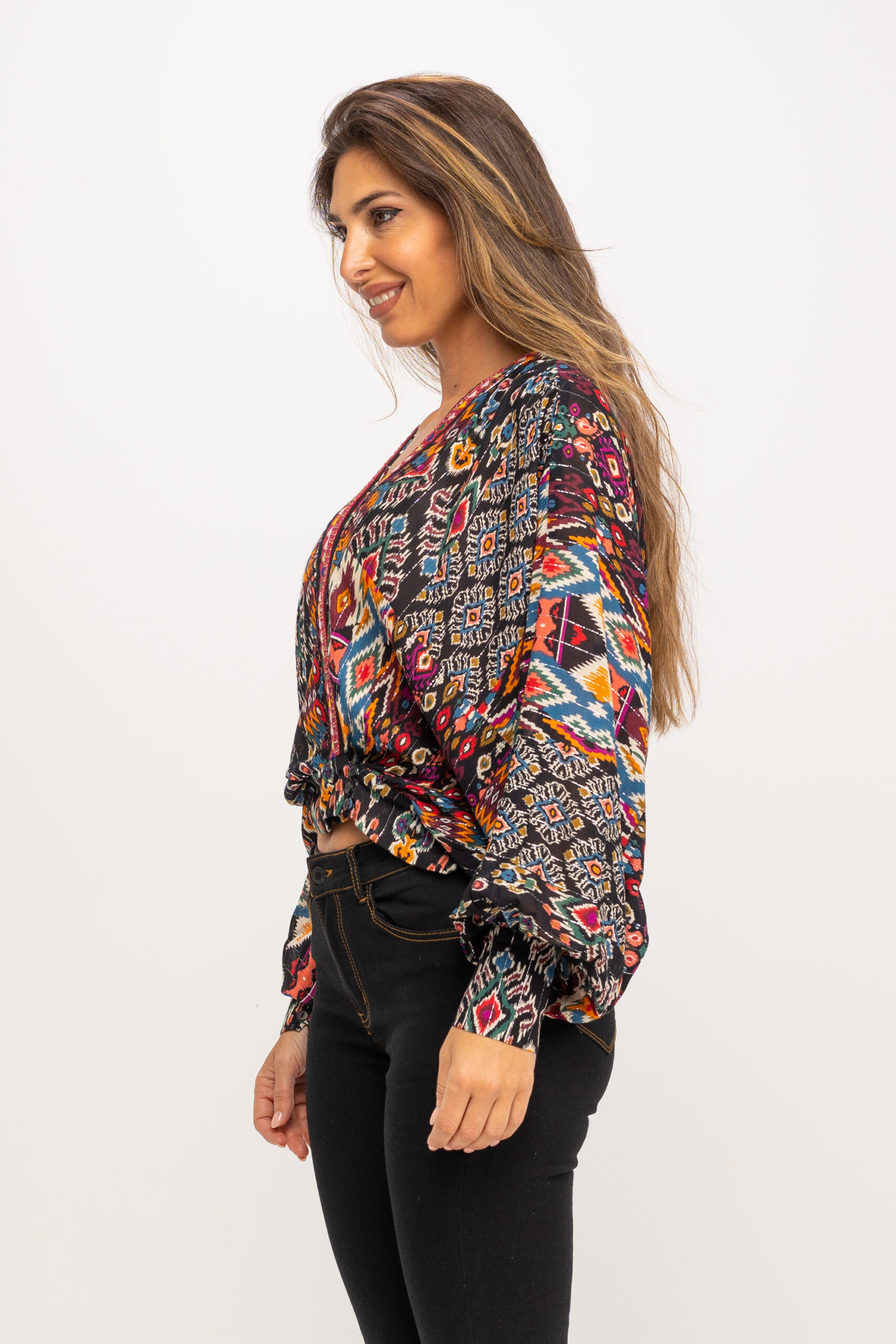 EMBROIDERY AND PRINTED BLOUSE WITH CROSSING NECKLINE 95%VISCOSA 5%LUREX