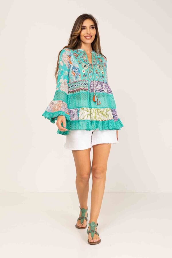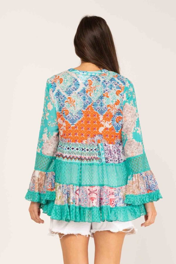 BLUSON ESTAMPADO CON MEZCLA DE COLORES Y BOHO LOOK, CON TIRAS DE LACE EN COLORES LISOS Y ADORNOS DE BORDADO Y LENTEJUELAS.VOLANTES EN MANGA Y BAJO
