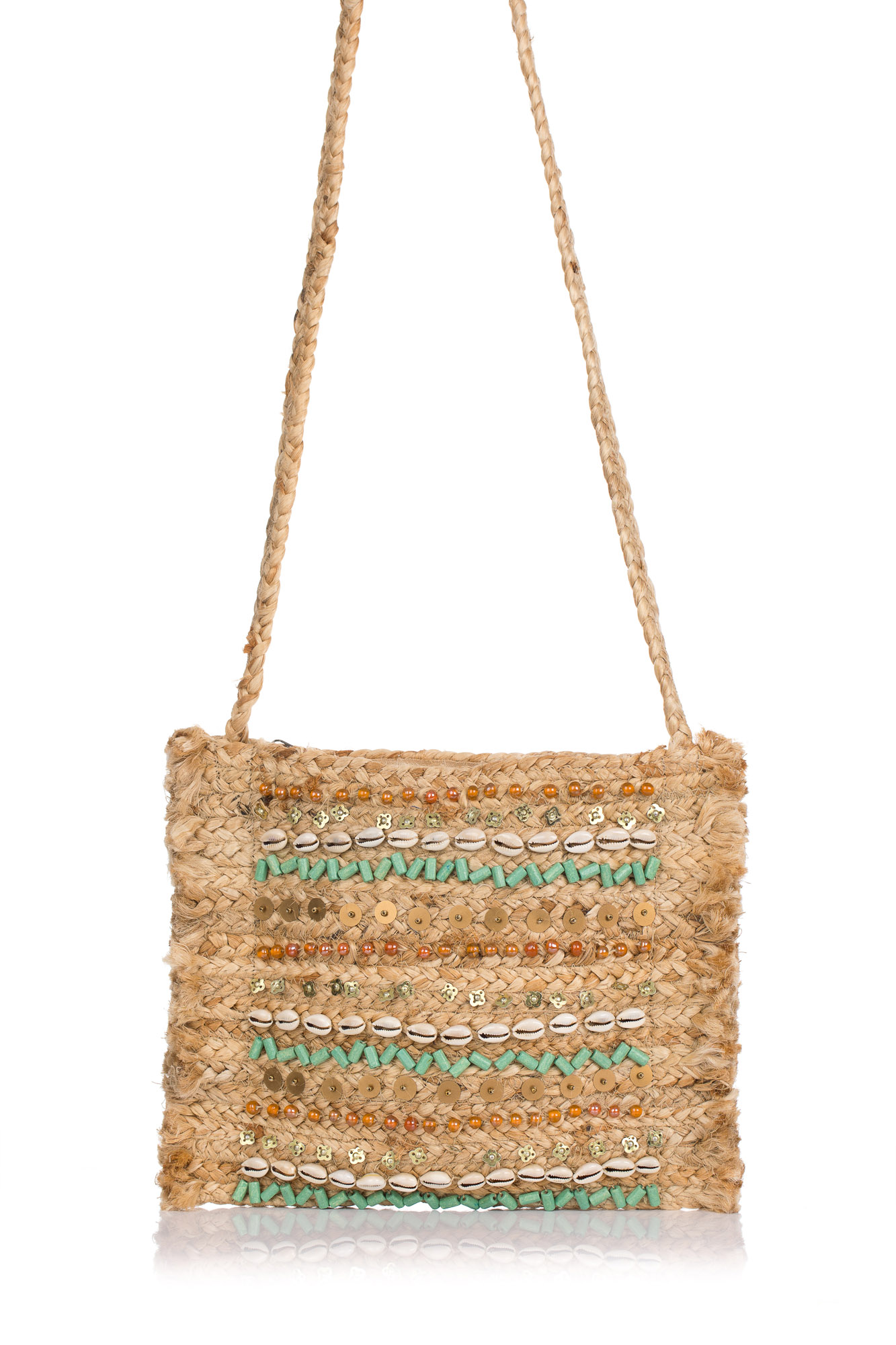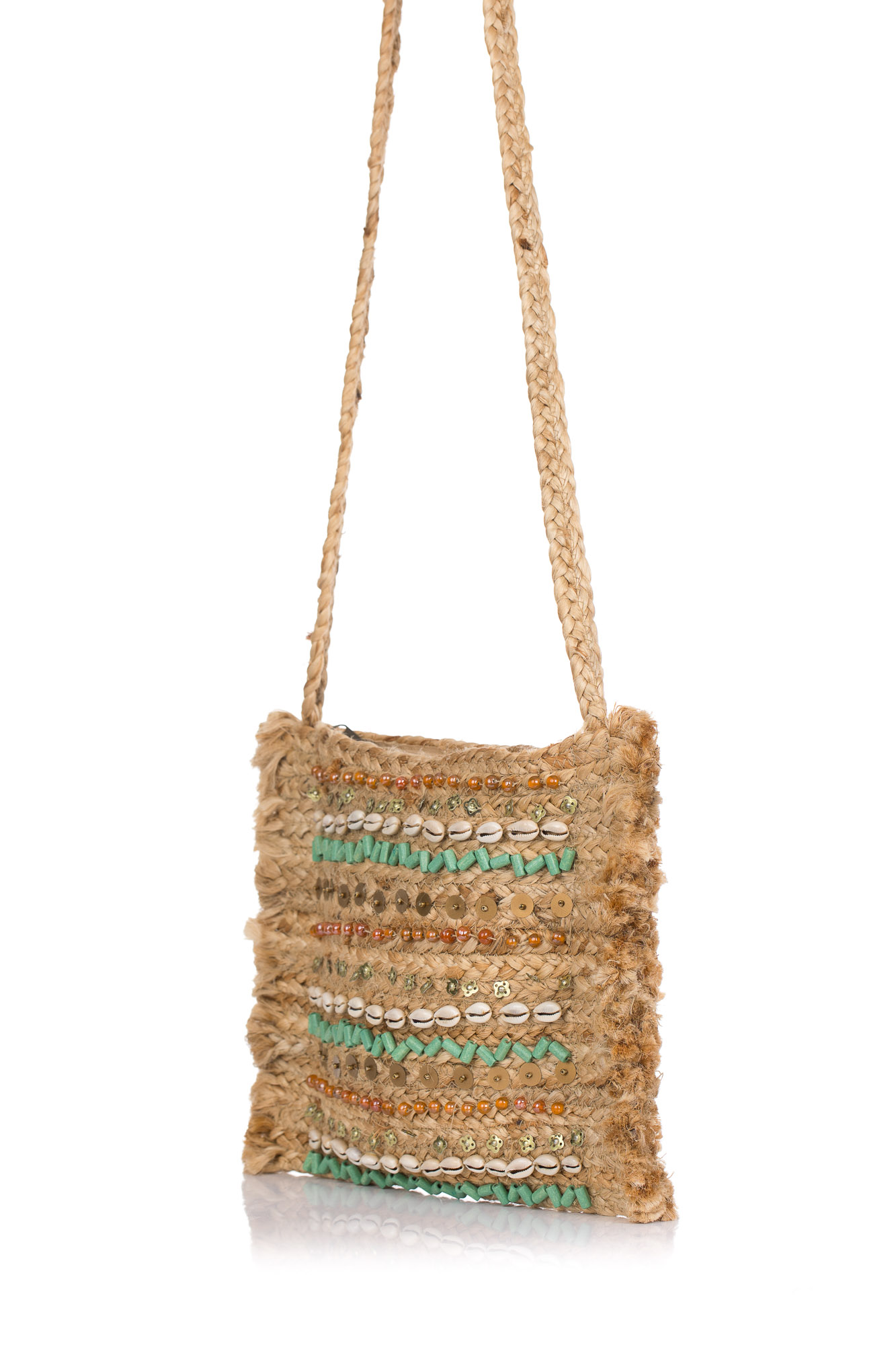 BOLSO ARTESANAL DECORADO CON ABALORIOS DE COLORES CONCHAS Y LENTEJUELAS 100% PAJA