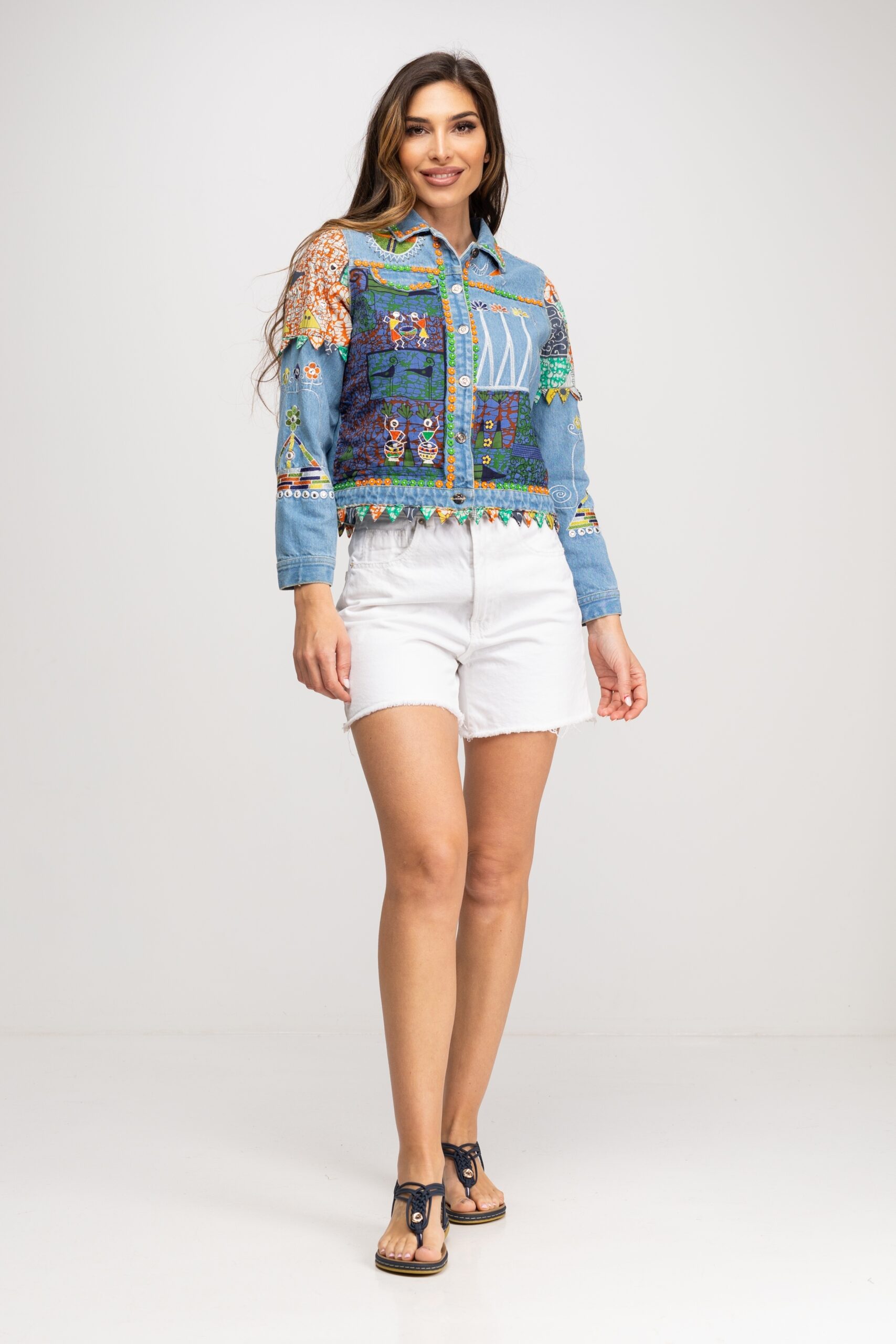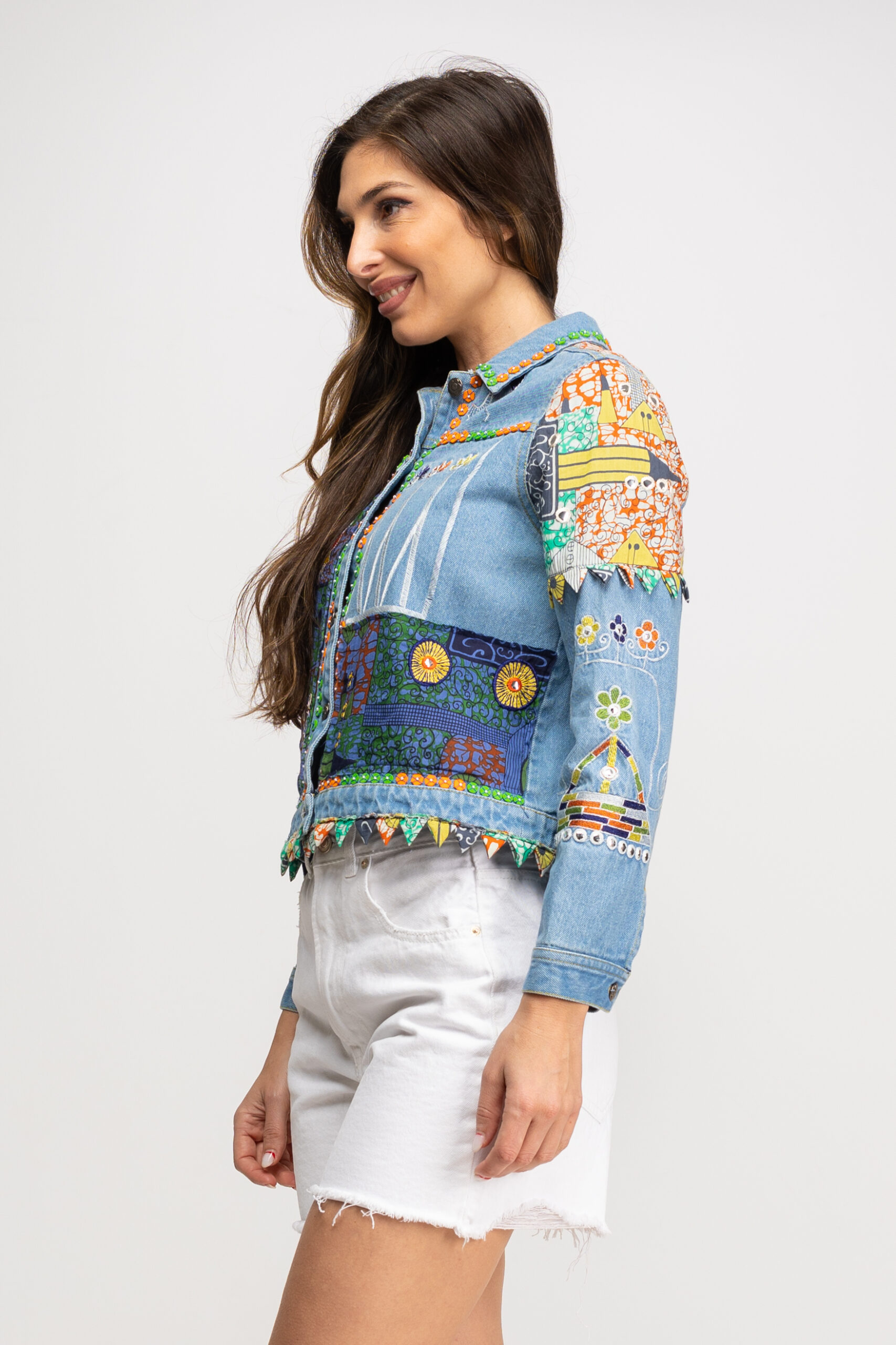 CHAQUETA DENIM BORDADA EN VARIOS COLORES CON BOTONES METALICOS 100% ALGODÓN