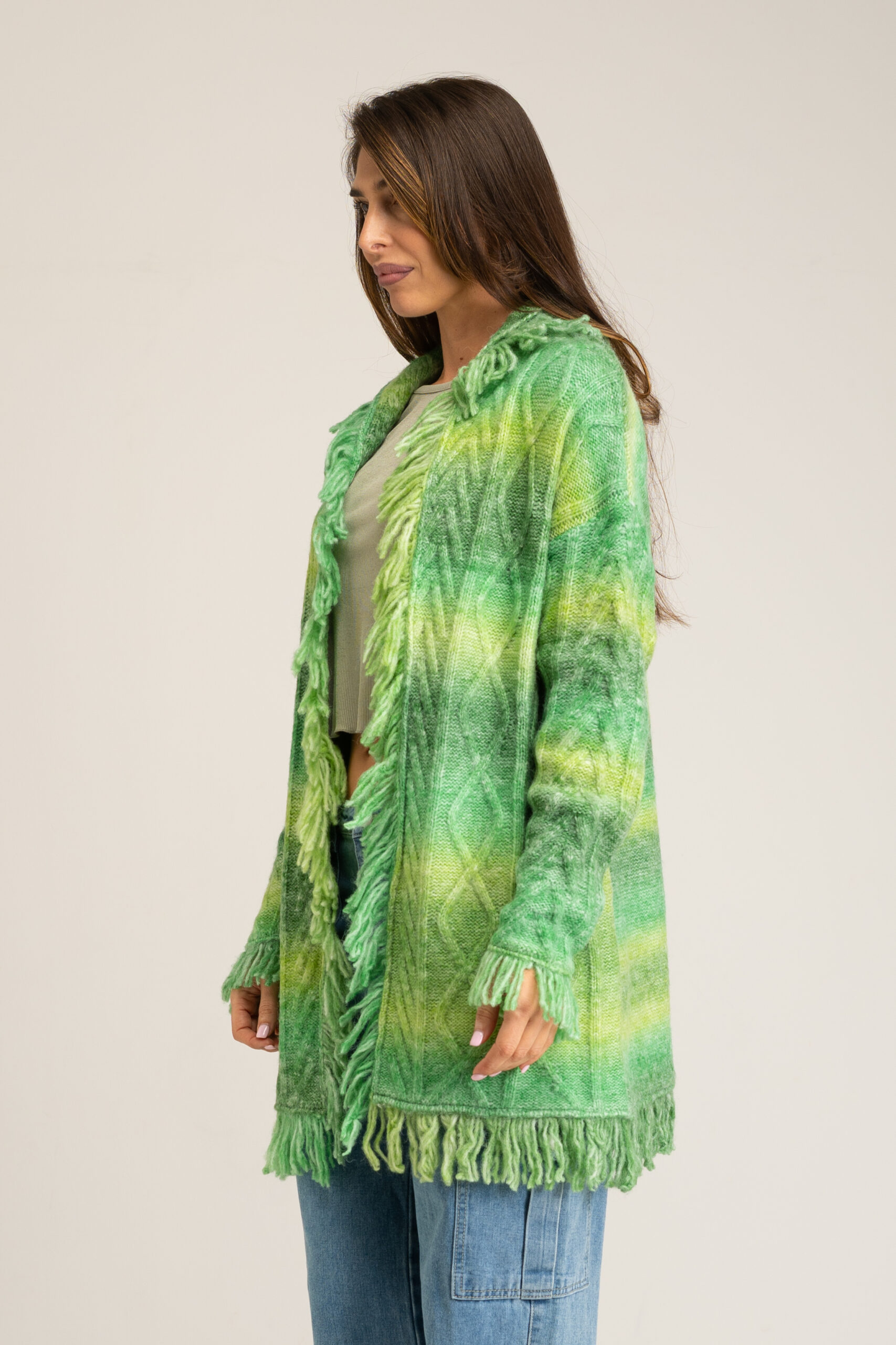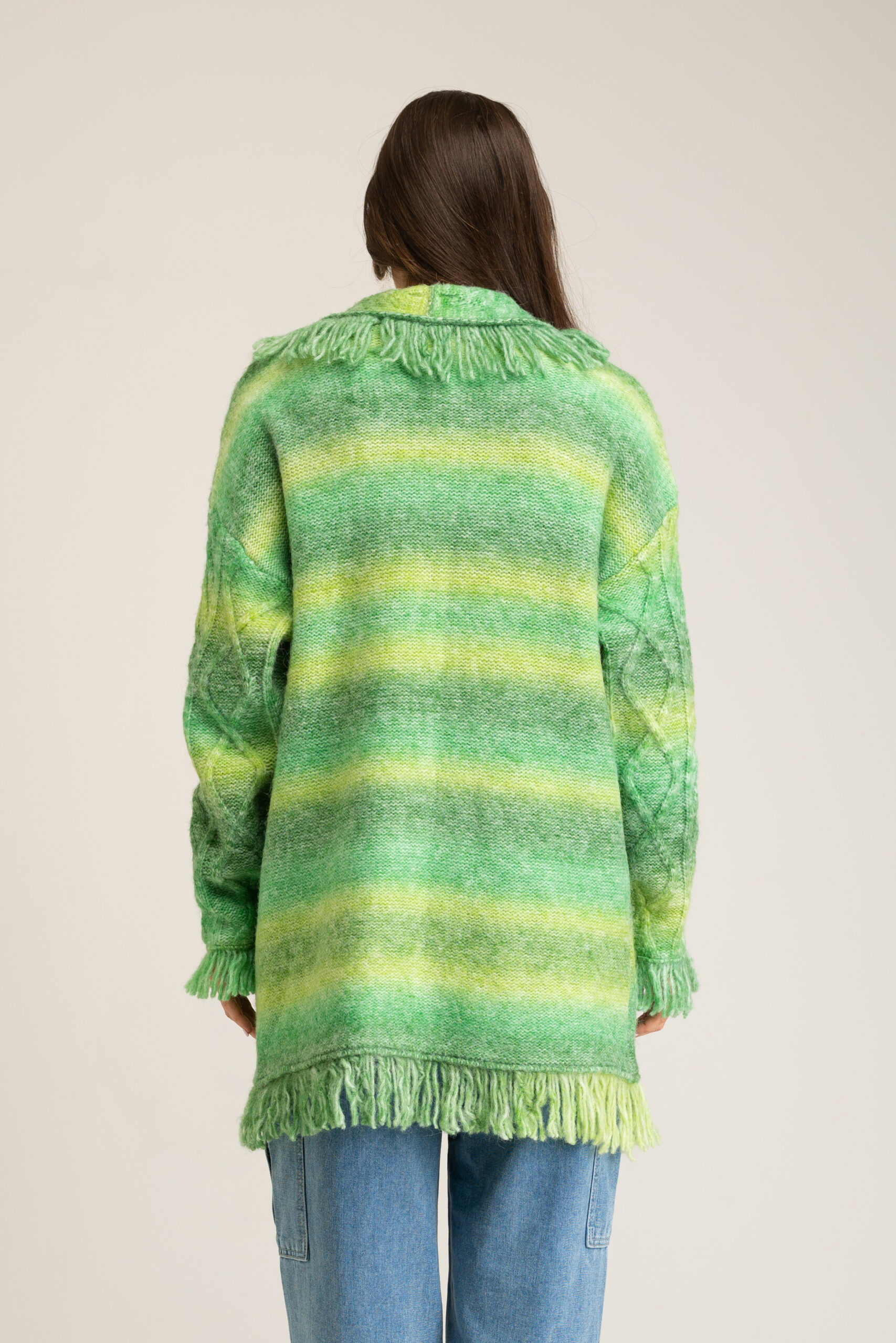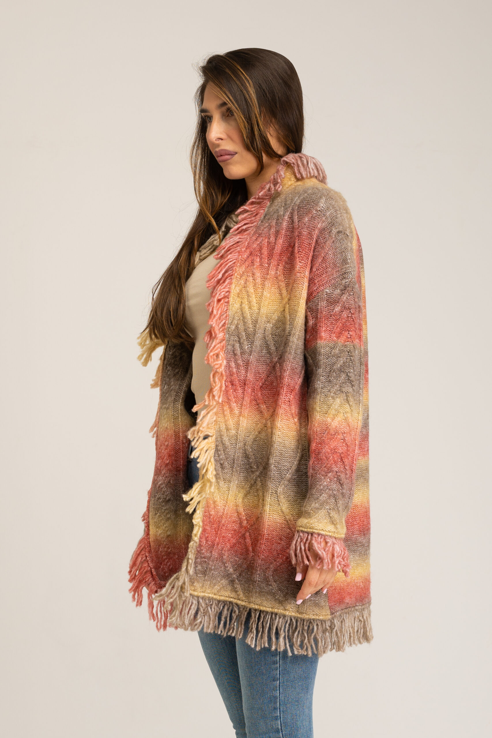 LONG CARDIGAN WITH FRINGES AND GRADIENT EFFECT 54%ACRYLIC 23%POLYESTER 20%NYLON 3%WOOL