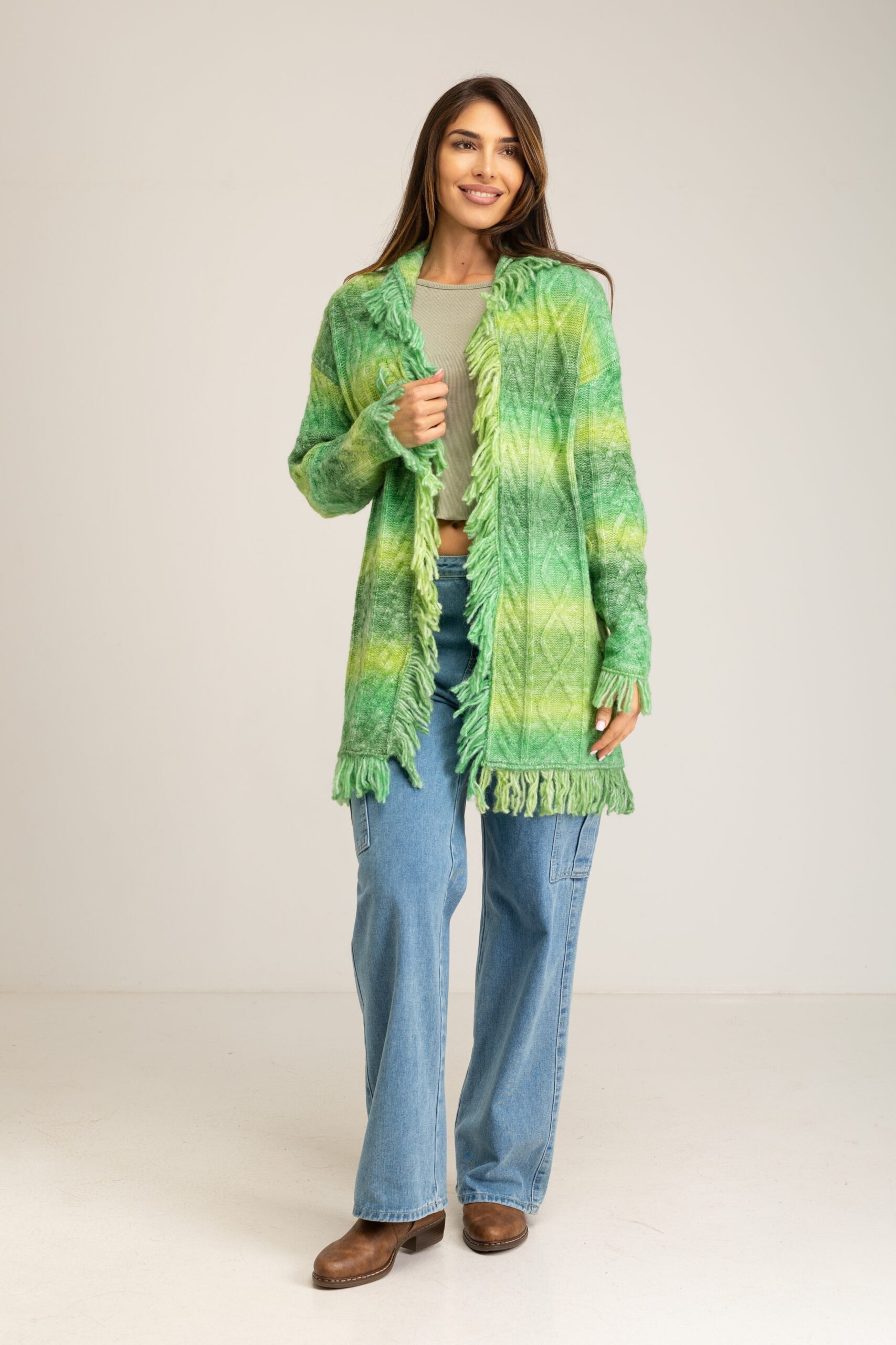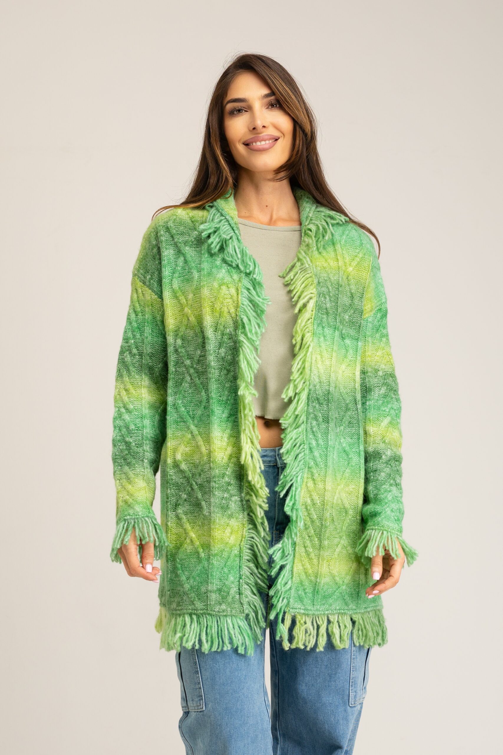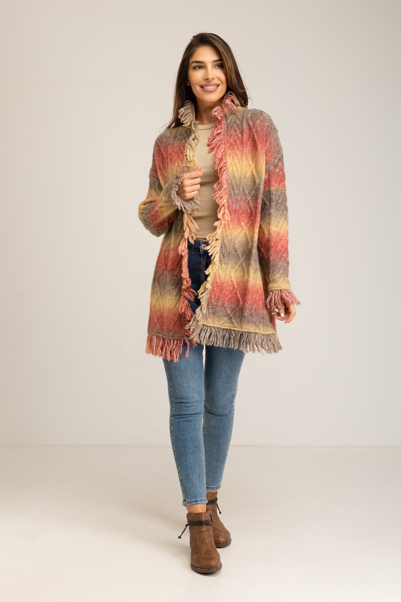 LONG CARDIGAN WITH FRINGES AND GRADIENT EFFECT 54%ACRYLIC 23%POLYESTER 20%NYLON 3%WOOL