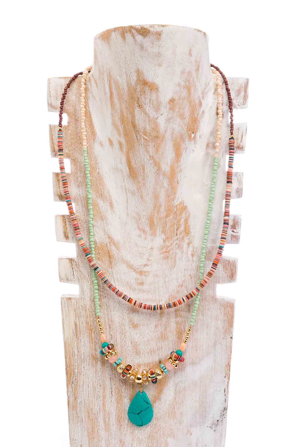COLLAR DE DOS VUELTAS CON ABALORIOS DE COLORES Y METAL TERMINADO EN PIEDRA CON TONALIDAD AZUL