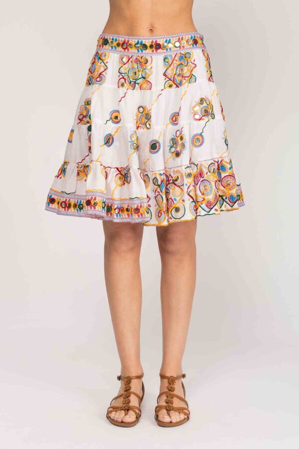FALDA MINI LISA CON DETALLES DE ESPEJOS Y BORDADOS, CINTURA CON ADORNOS DE ESPEJOS, Y CORTES EN TODO EL LARGO DE LA FALDA.