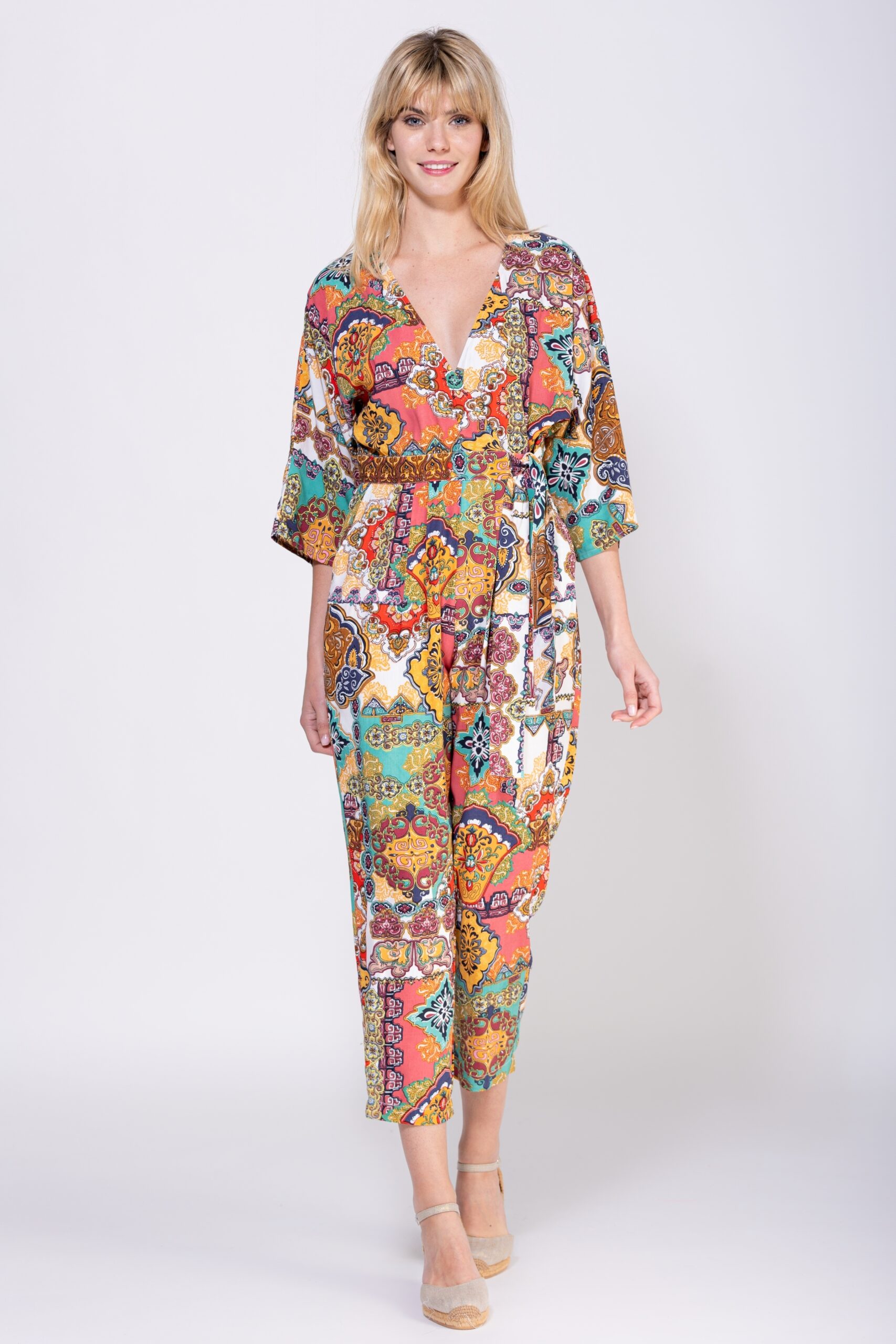 MONO CON LARGO HASTA EL TOBILLO, MANGA 3/4 CUELLO EN V, LAZO PARA AJUSTAR EN CINTURA, BOLSILLOS LATERALES 100% VISCOSA