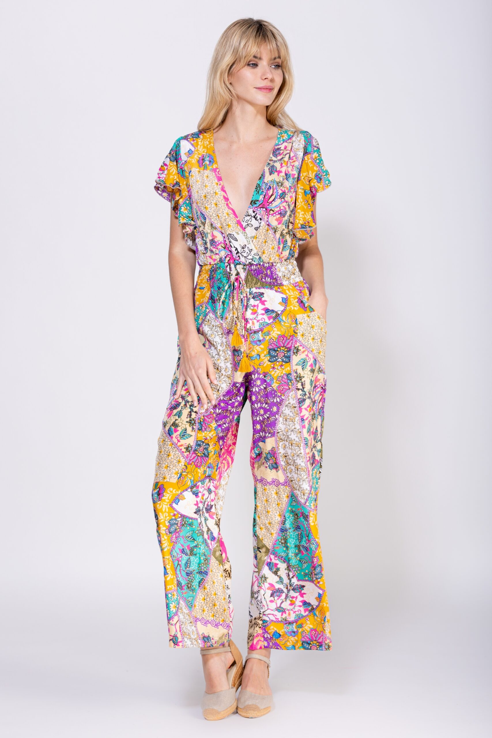 MONO LARGO ESTAMPADO CON MANGA CORTA ACABADA EN VOLANTE, CUELLO CRUZADO, CORTE BAJO PECHO Y CINTURA CON ENGOMADO Y CORDON PARA AJUSTAR