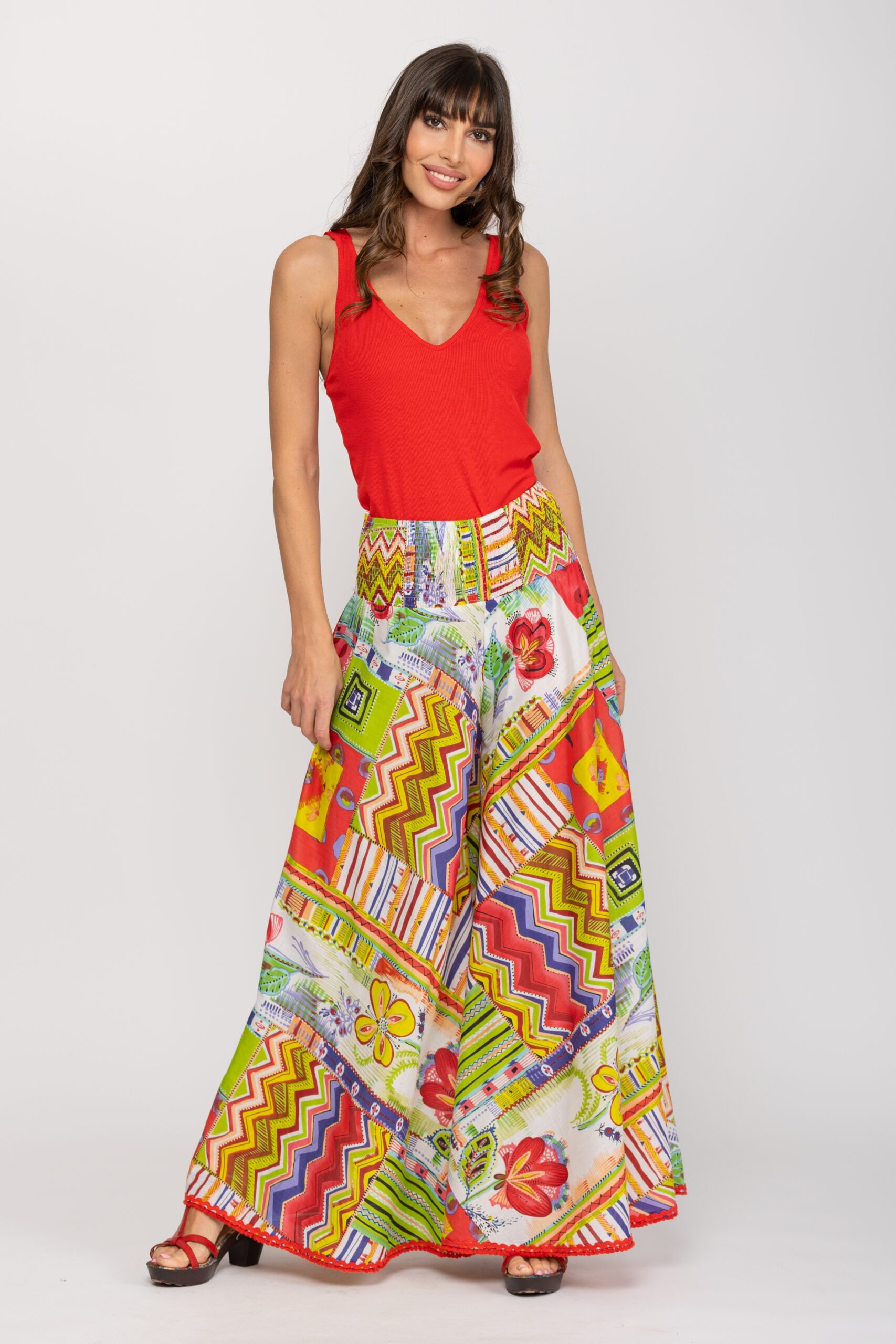 PANTALON ESTAMPADO LARGO, CINTURA CON ELASTICO Y PATA MUY ANCHA CON TIRAS DE LACE EN BAJO 100% ALGODÓN