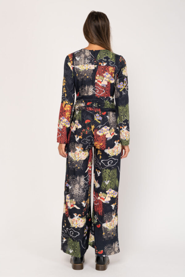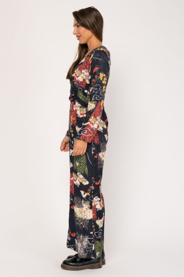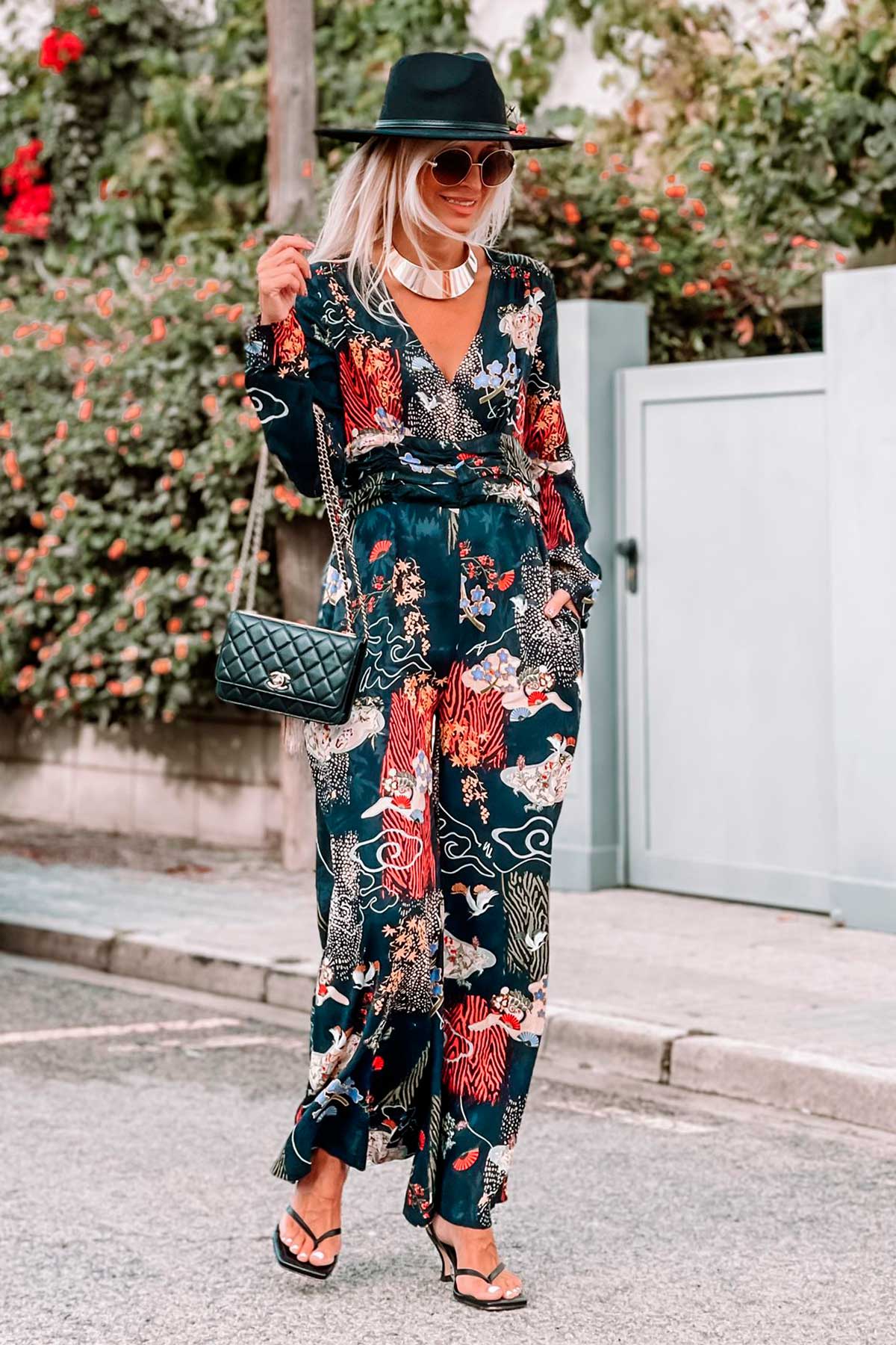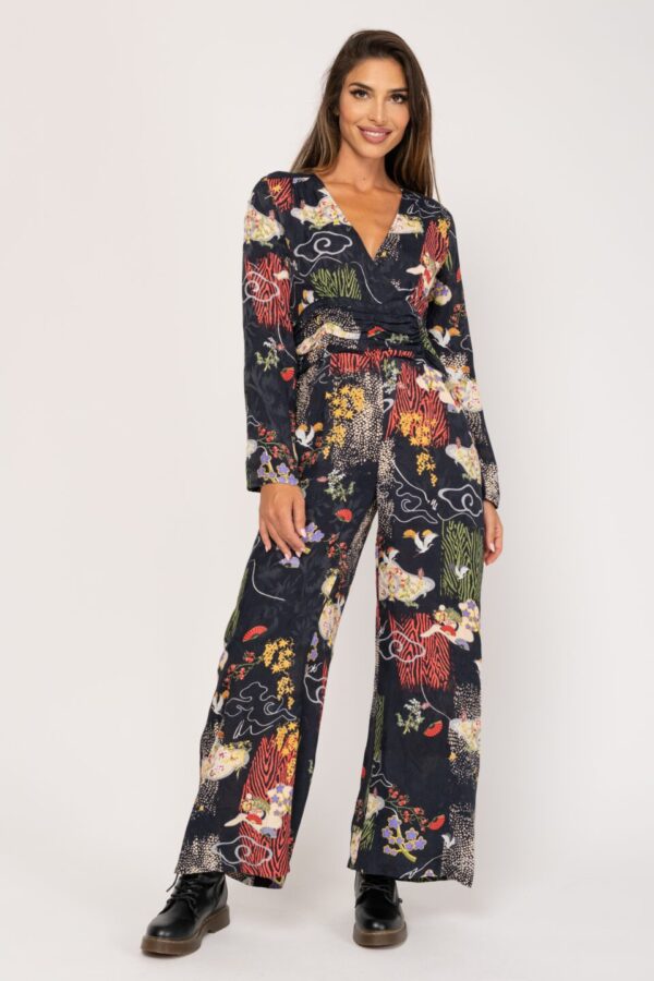 MONO CUERPO COMPLETO ESTAMPADO CON CUELLO EN V 100%VISCOSA LA MODELO MIDE 1,80m Y UTILIZA UNA TALLA M