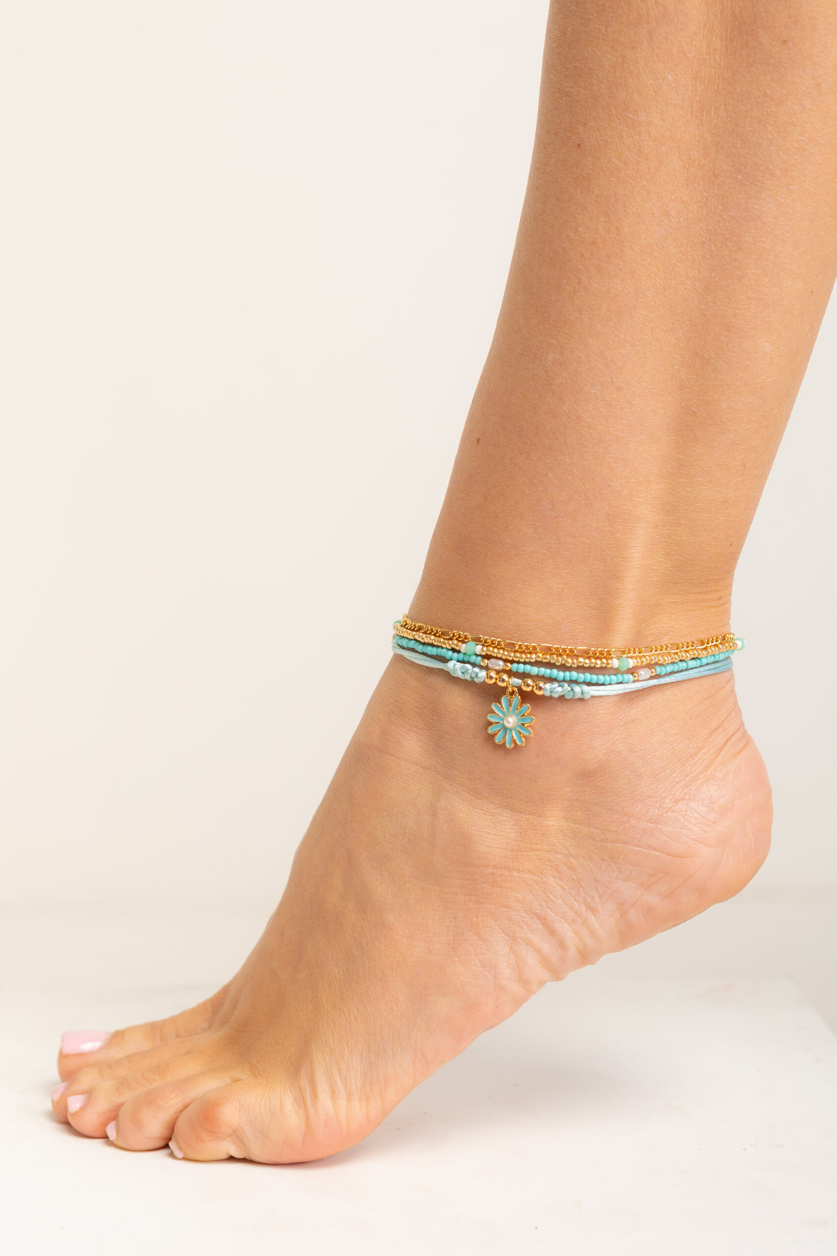 TOBILLERA CON VARIAS VUELTAS DE METAL Y ADORNOS CON ABALORIOS DE COLORES TURQUESA + METAL