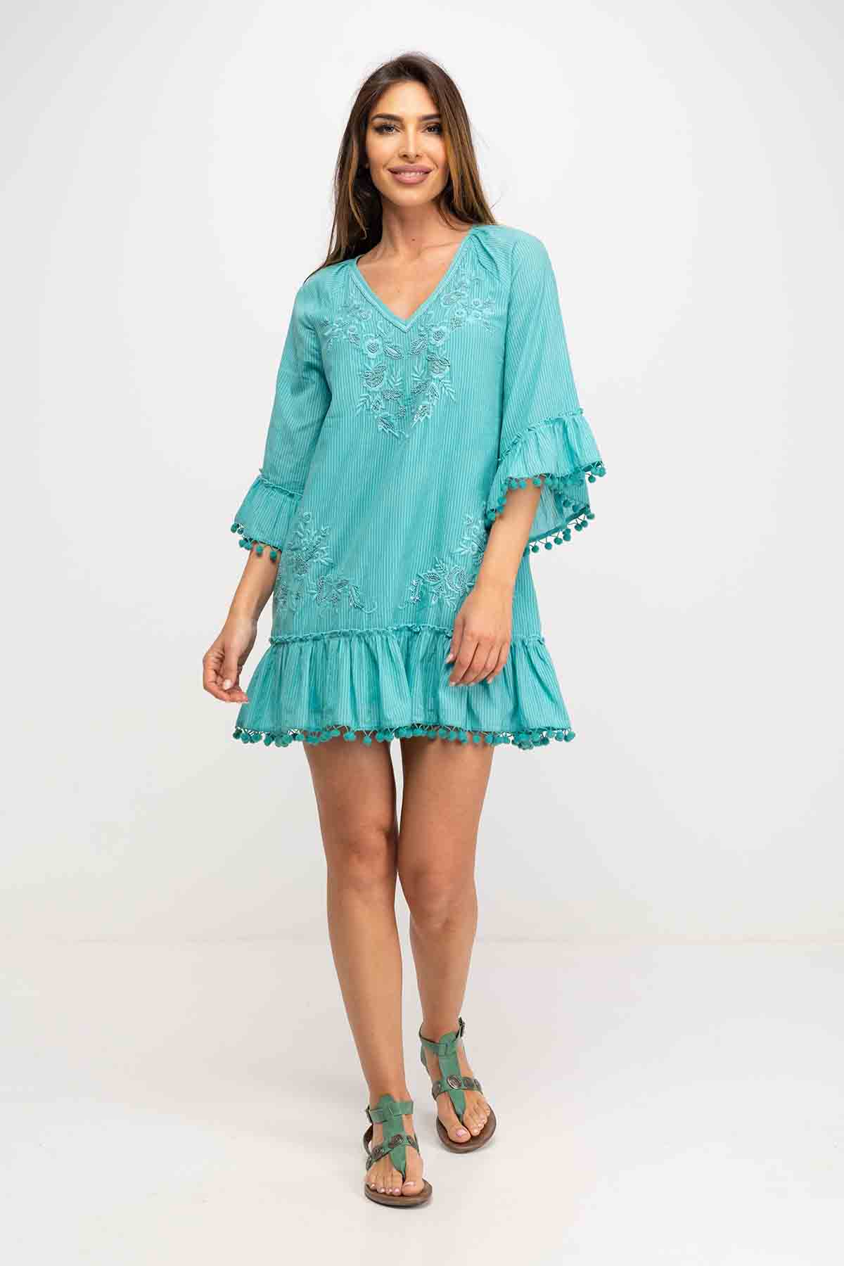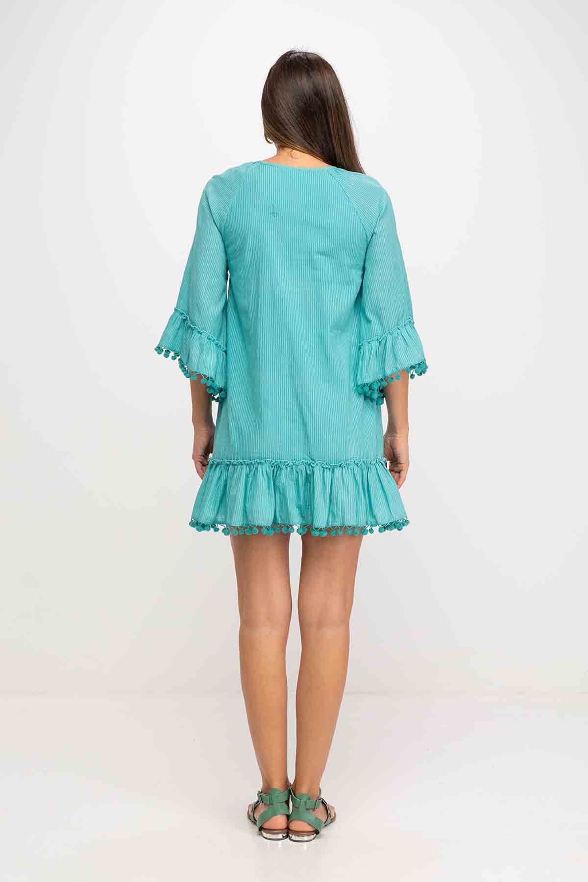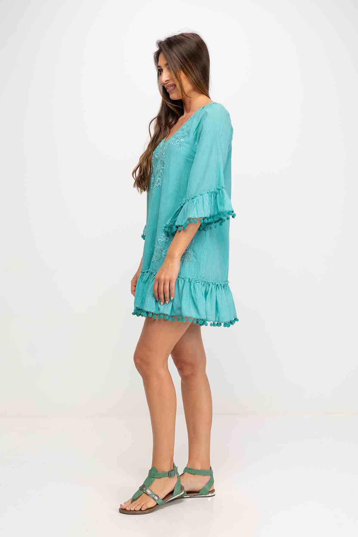 TUNICA AMPLIA TIPO PLAYERA DE RAYAS, CON DECORACION DE BORDADOS Y CUENTAS, ESCOTE PICO CON MANGA 3/4 Y TERMINACIONES DE POMPONES