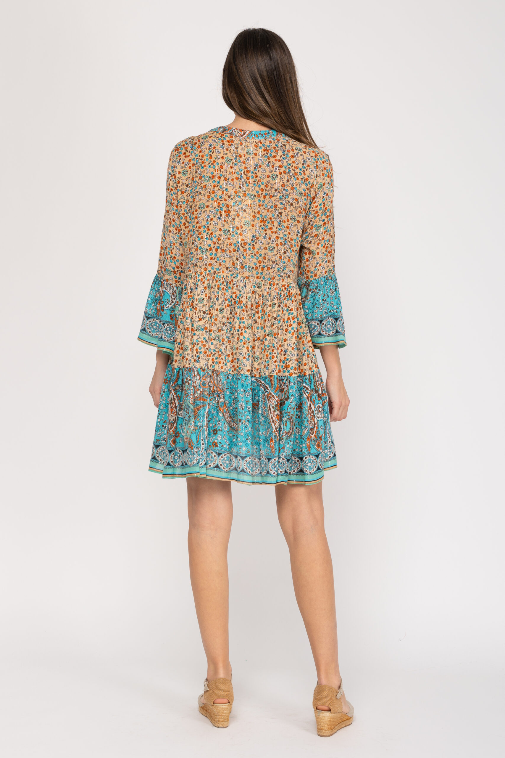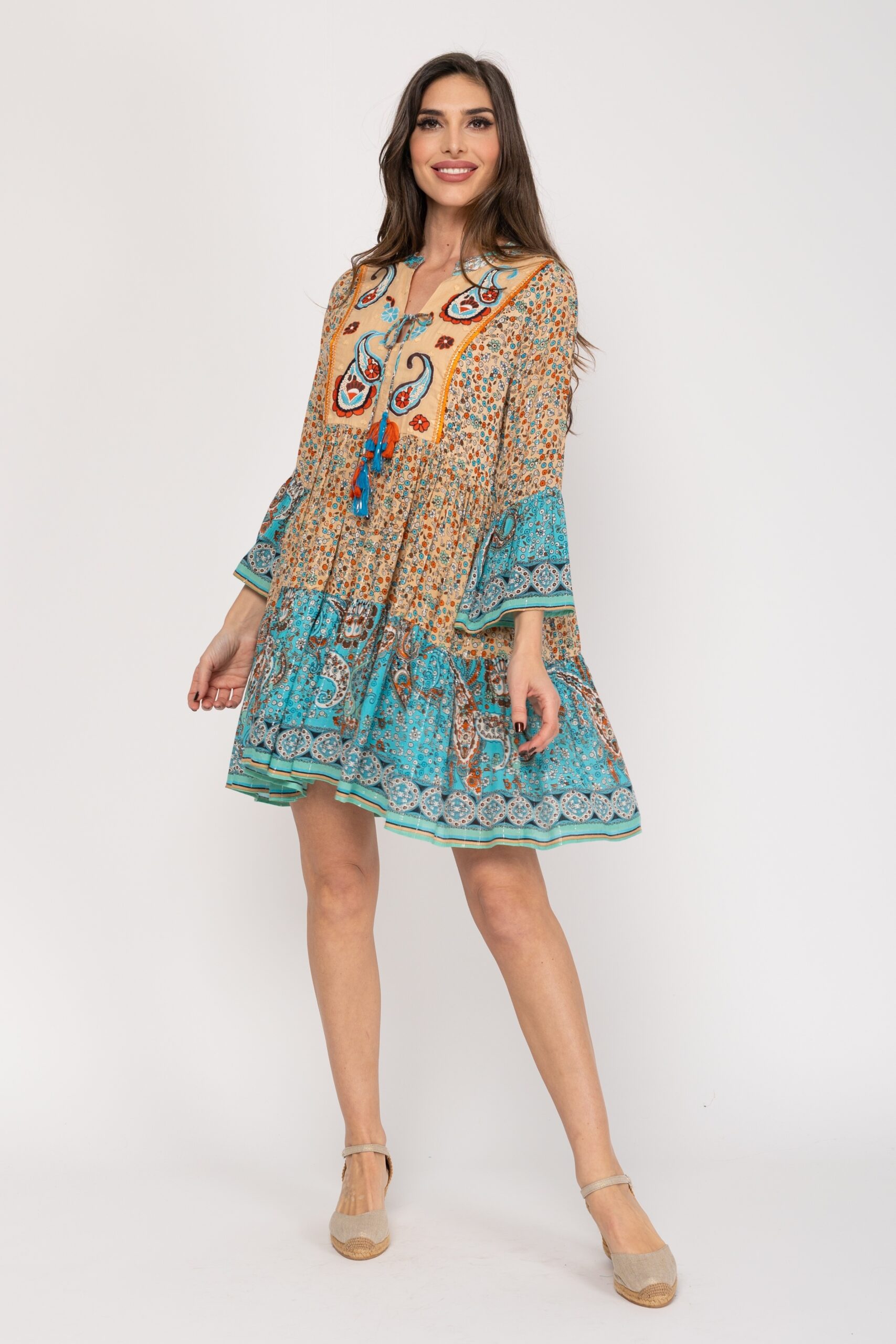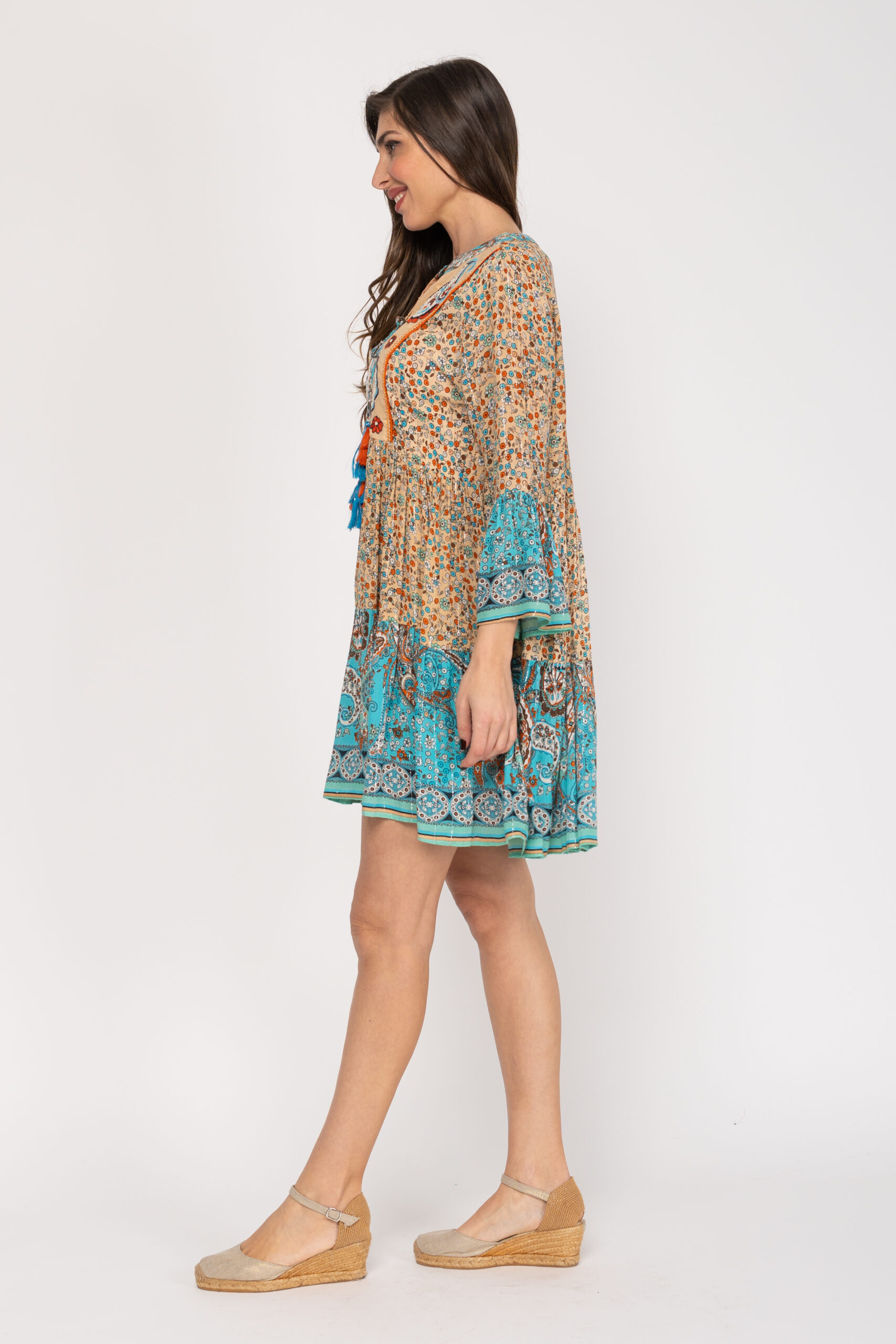 TUNICA CON DOS ESTAMPADOS LIBERTY CORTE EN EL PECHO CON CACHEMIRES BORDADOS Y CON ABALORIOS 100% ALGODÓN