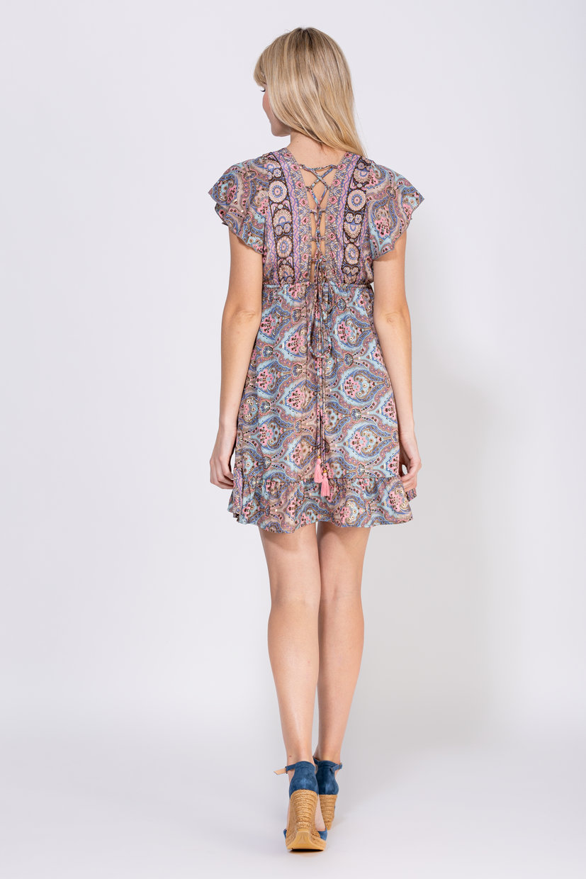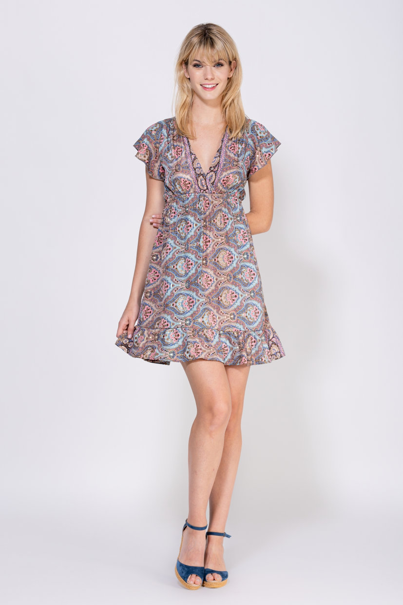 VESTIDO CORTO ESTAMPADO CON ELASTICO EN CINTURA CUELLO CRUZADO TERMINADO EN V MANGAS VOLANTE