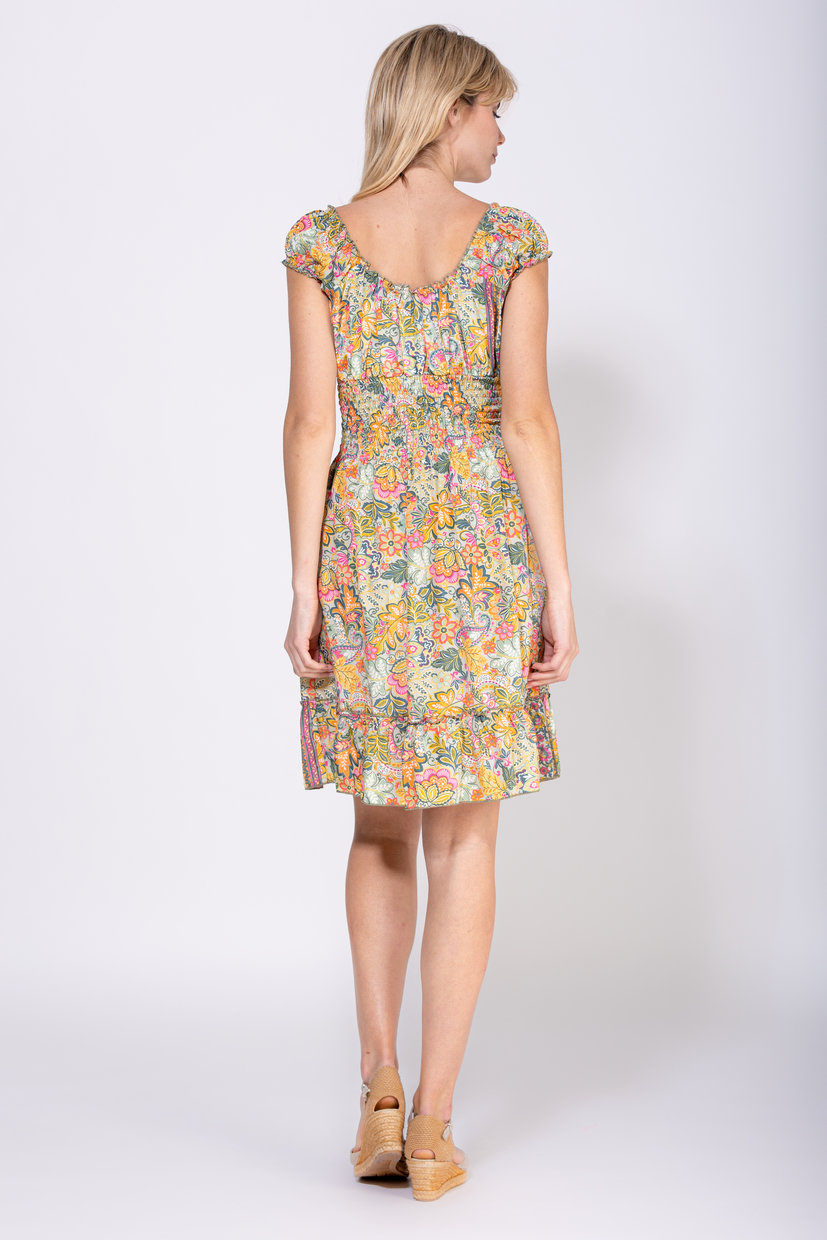 VESTIDO CORTO ESTAMPADO CON ESCOTE CRUZADO HASTA CINTURILLA ELASTICA, MANGAS TERMINADAS CON ELASTICO