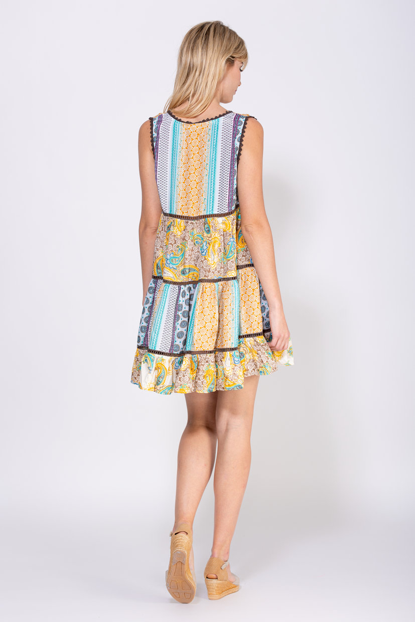 VESTIDO CORTO ESTAMPADO CON VARIOS CORTES SEPARADOS CON LA TIRAS DE LACES CUELLO TERMINADO EN V 100% POLIESTER