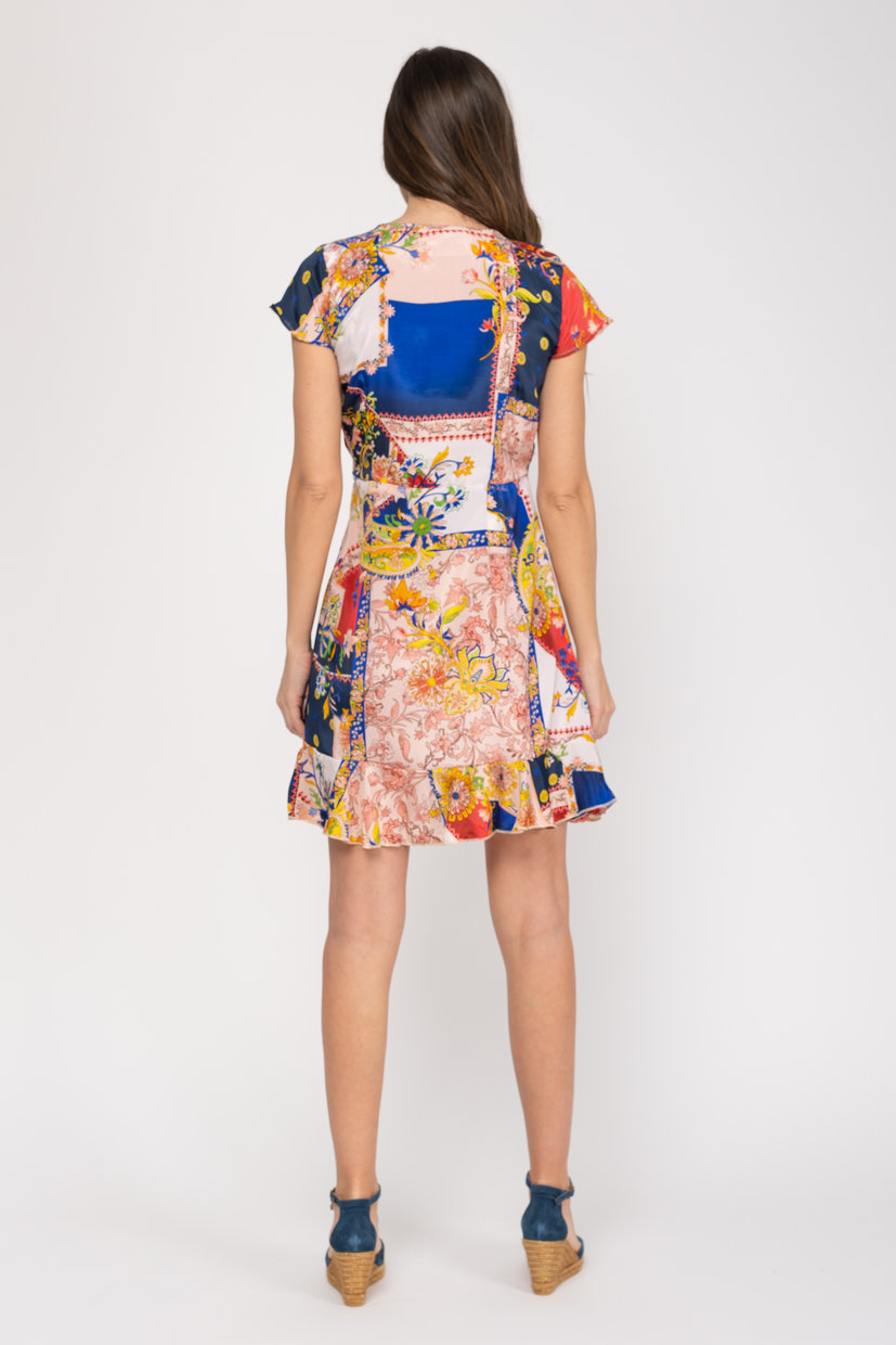 VESTIDO CORTO ESTAMPADO CRUZADO CON VOLANTE CORTE EN EL PECHO CUELLO EN V 100% POLIESTER