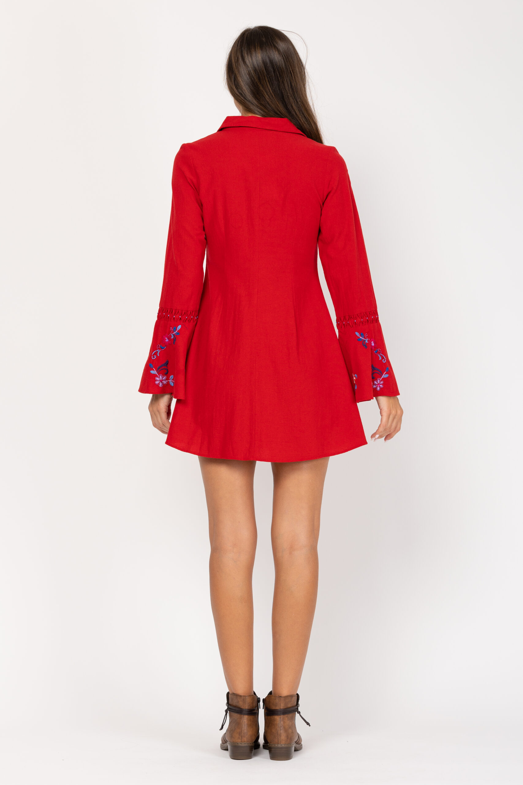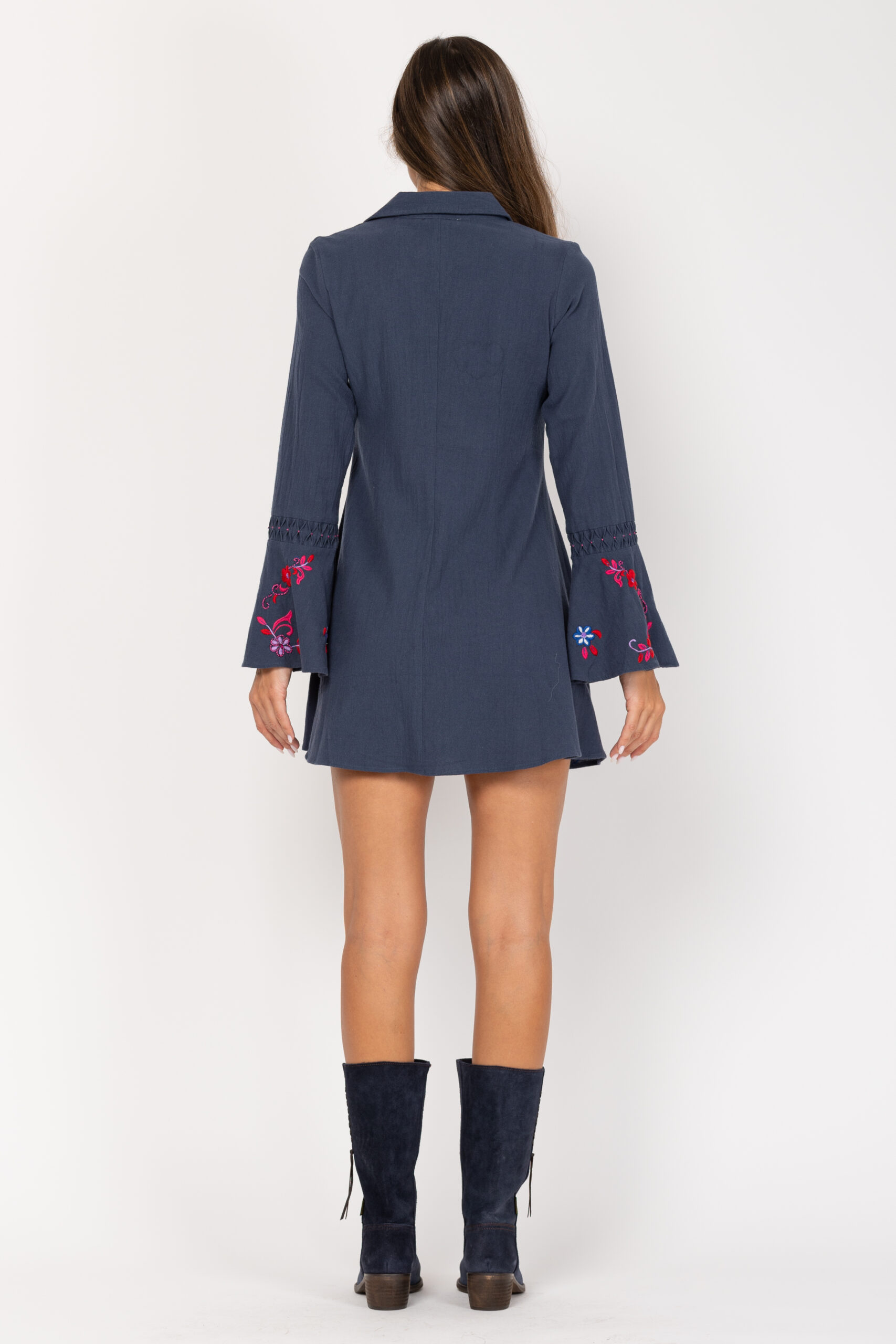 VESTIDO CORTO LISO, ABOTONADO, CON BONITOS BORDADOS EN MANGA PECHO Y BAJO, CUELLO CAMISERO TERMINADO EN PICO