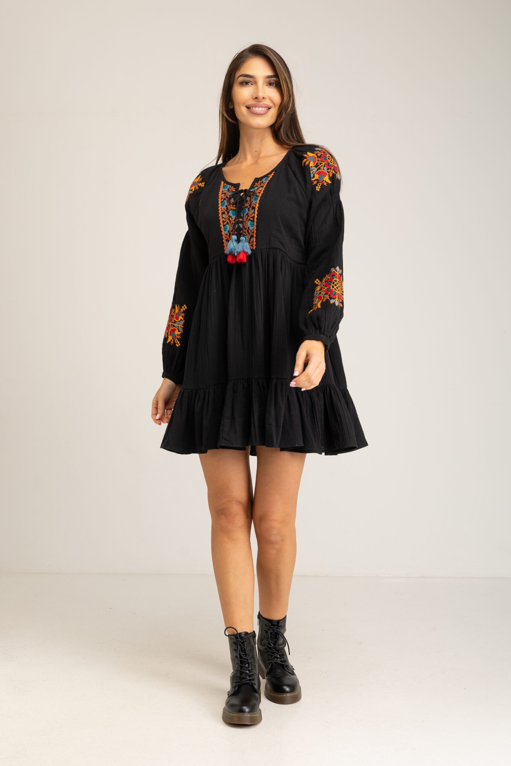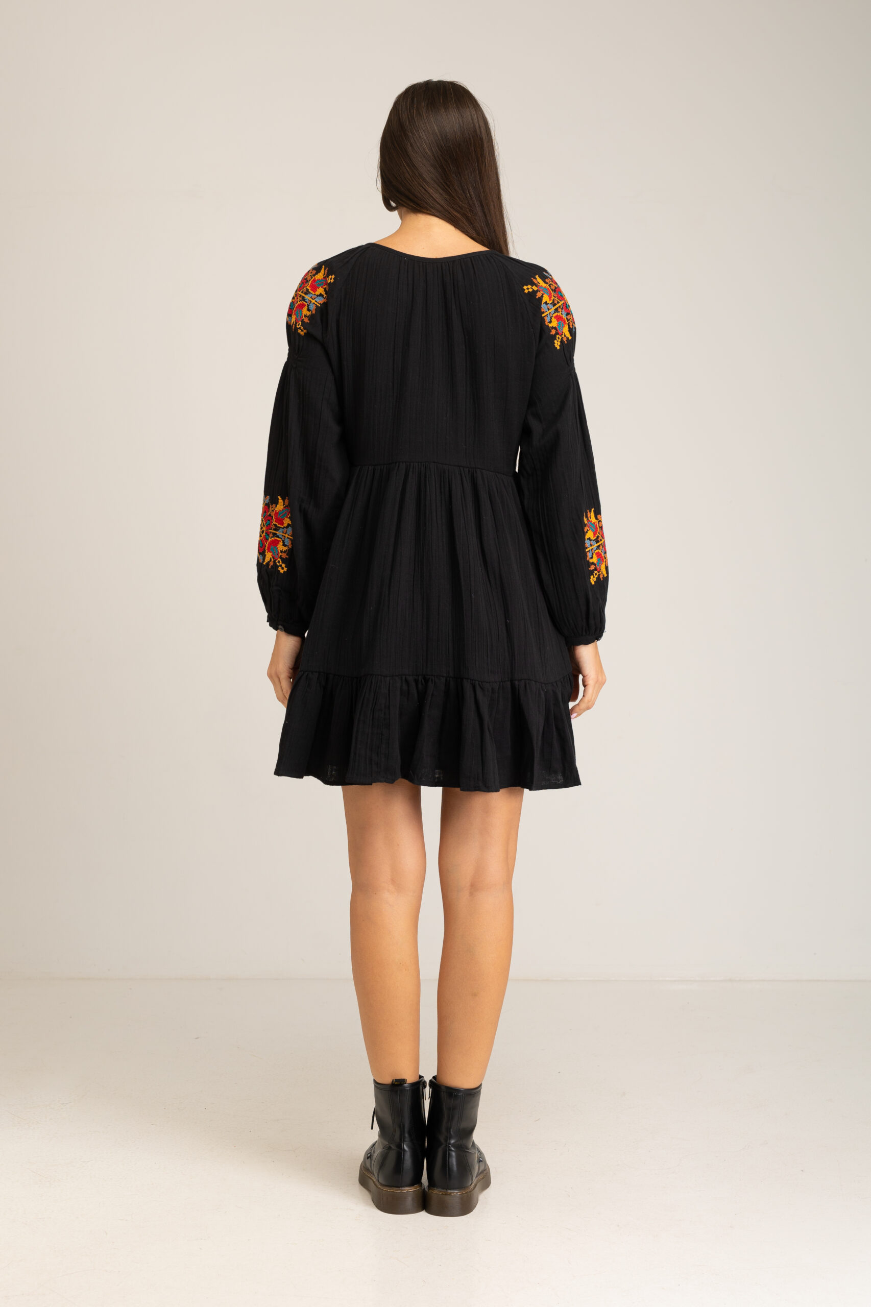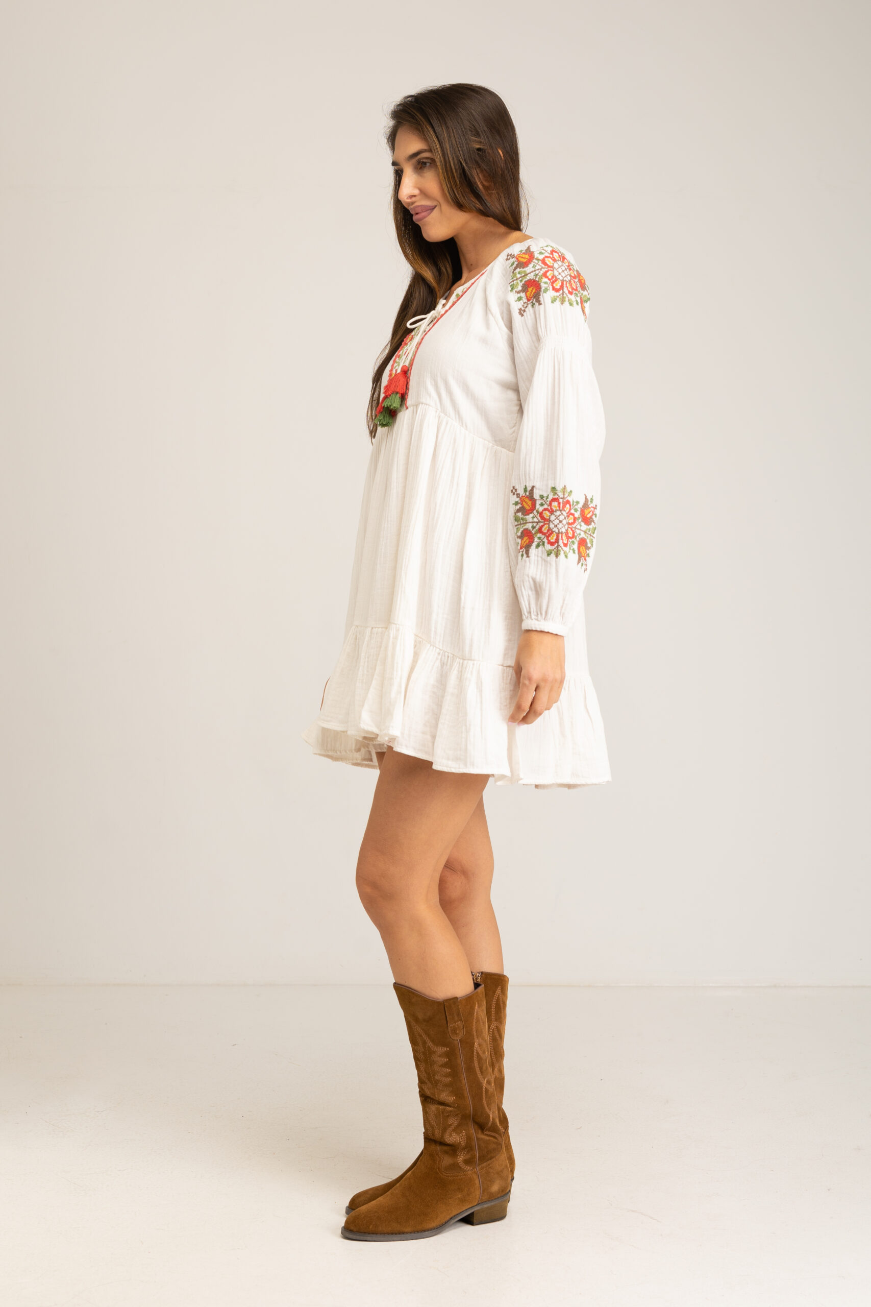 VESTIDO CORTO LISO ALGODÓN RUSTICO BORDADO CUELLO Y MANGAS