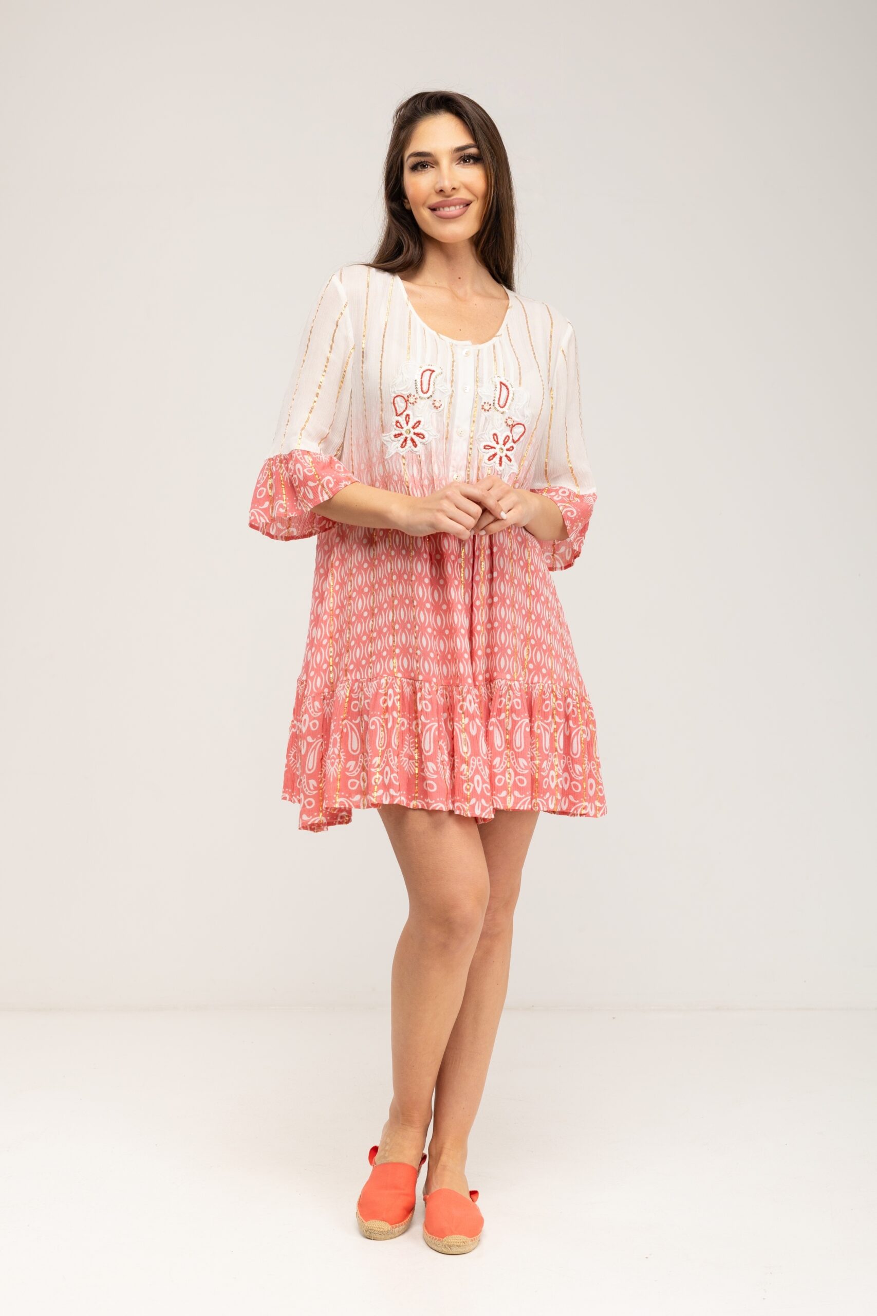 VESTIDO DEGRADADO CUELLO MAO MANGA 3/4 CON BORDADO Y LUREX 90% VISCOSA 10% LUREX