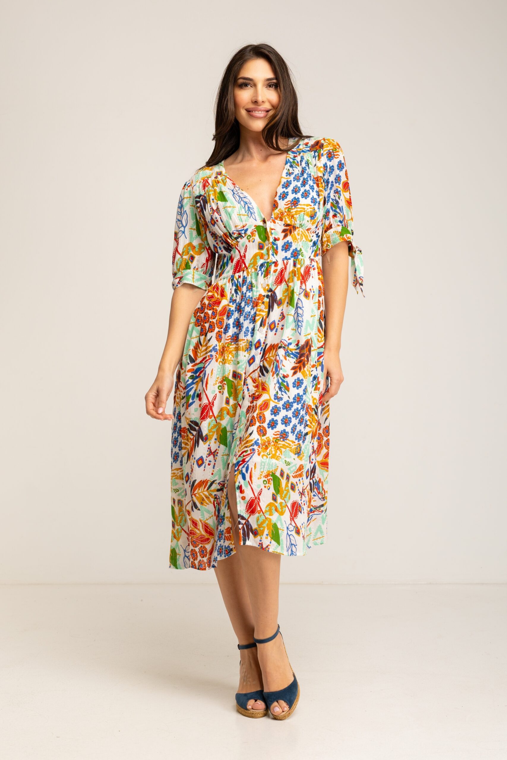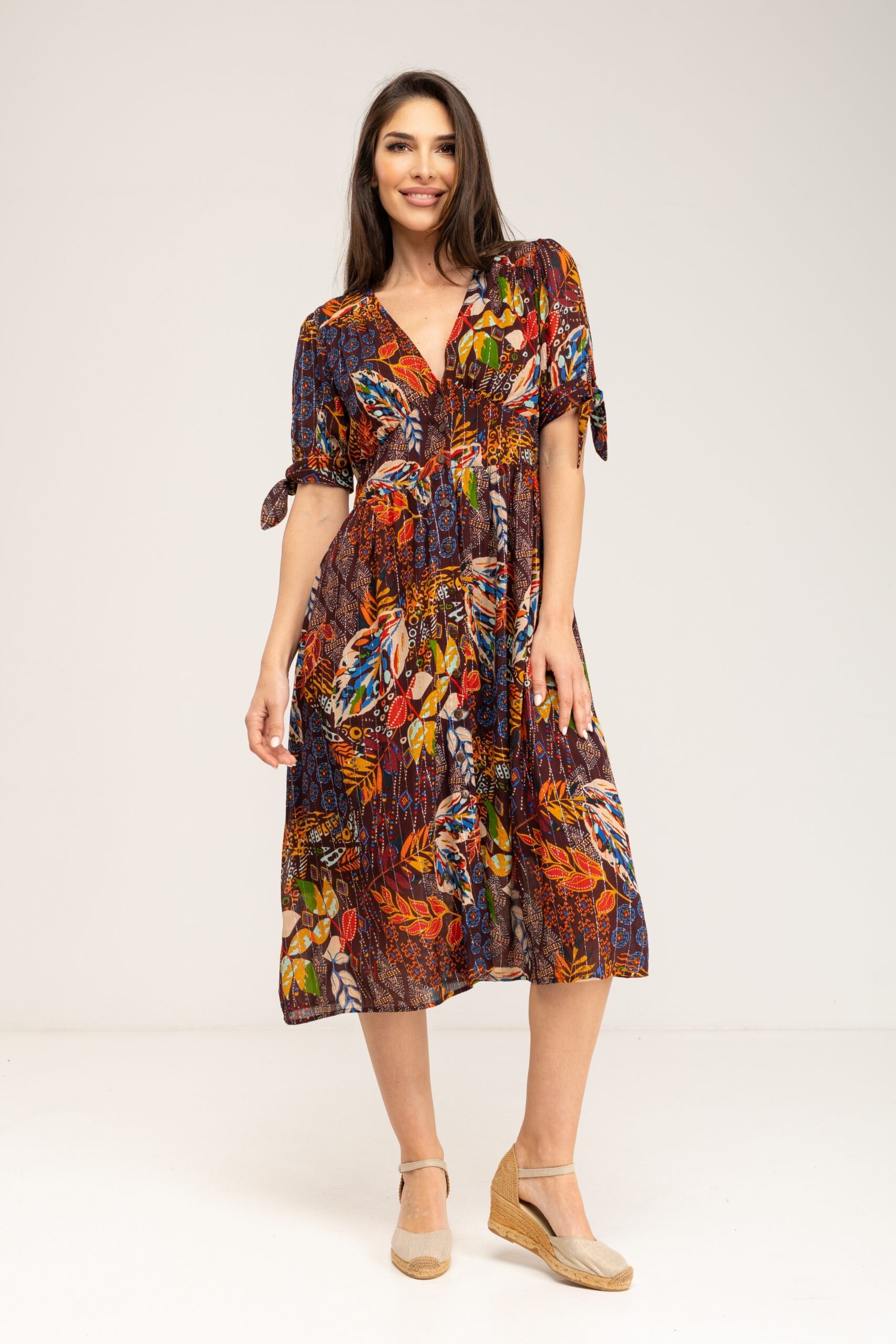 VESTIDO ESTAMPADO ABOTONADO CUELLO EN V Y MANGA BOMBACHO 100% VISCOSA