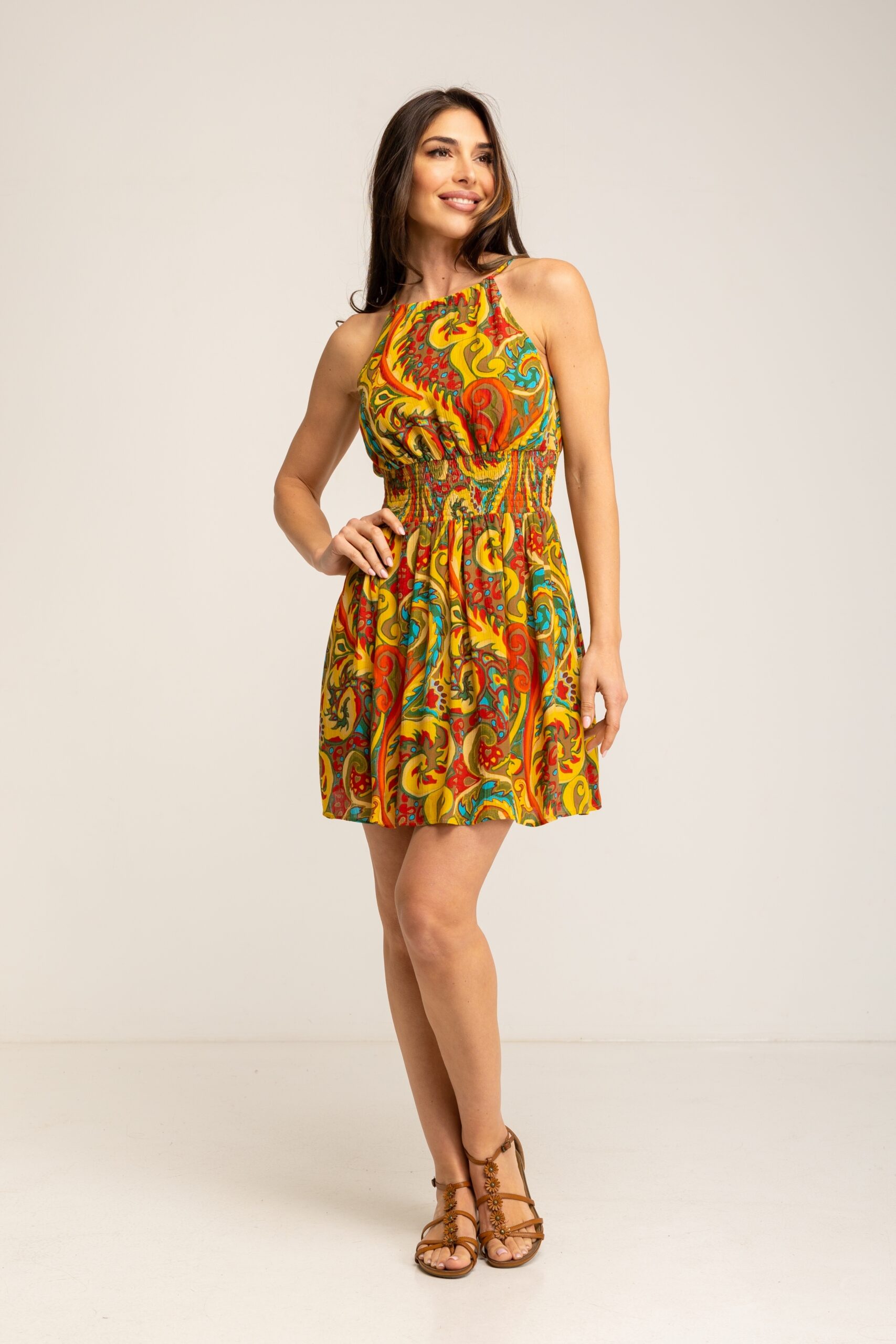 VESTIDO ESTAMPADO CON GOMA NIDO DE ABEJA EN CINTURA Y CUELLO HALTER 100% VISCOSA