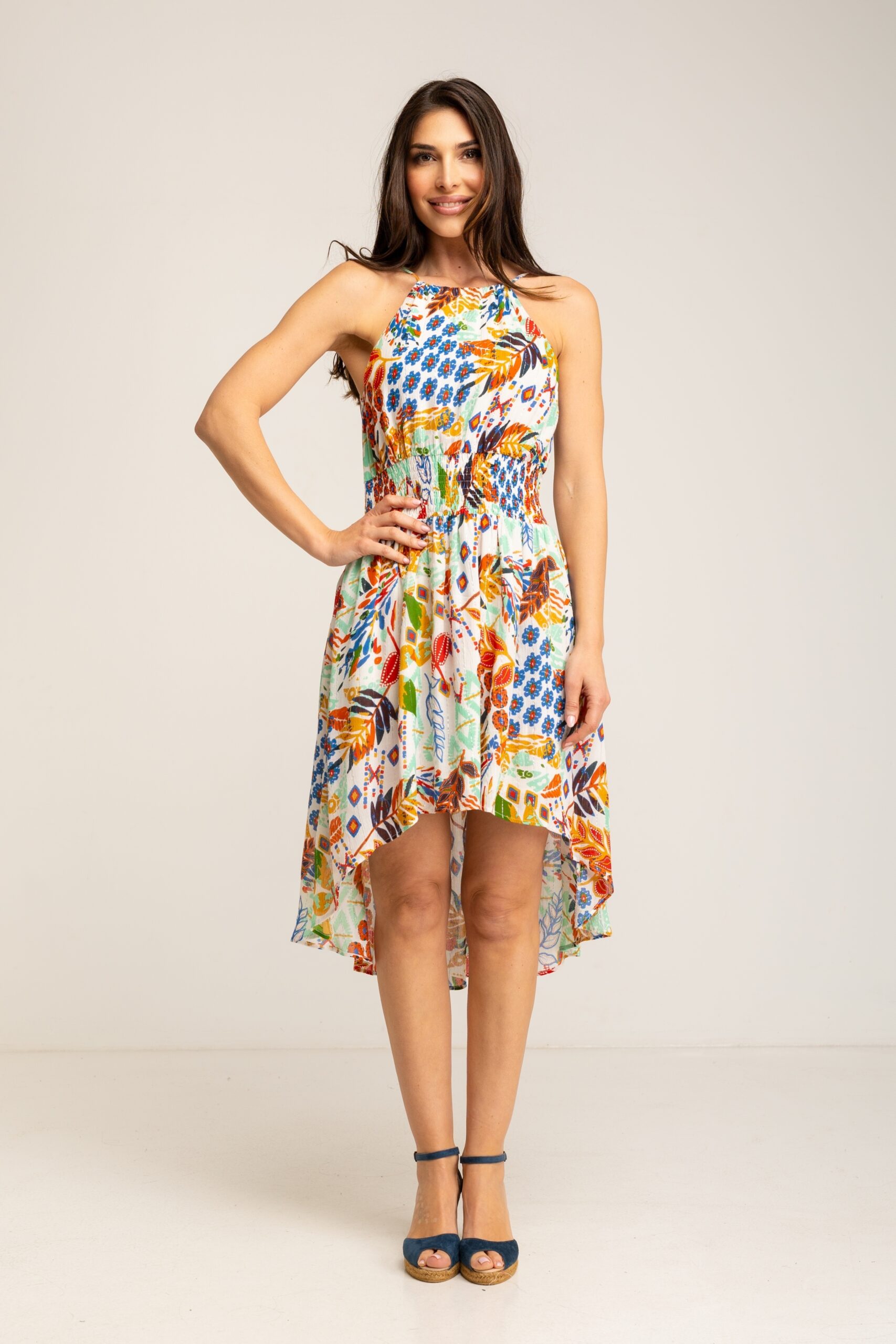VESTIDO ESTAMPADO CON GOMA NIDO DE ABEJA EN CINTURA Y CUELLO HALTER 100% VISCOSA
