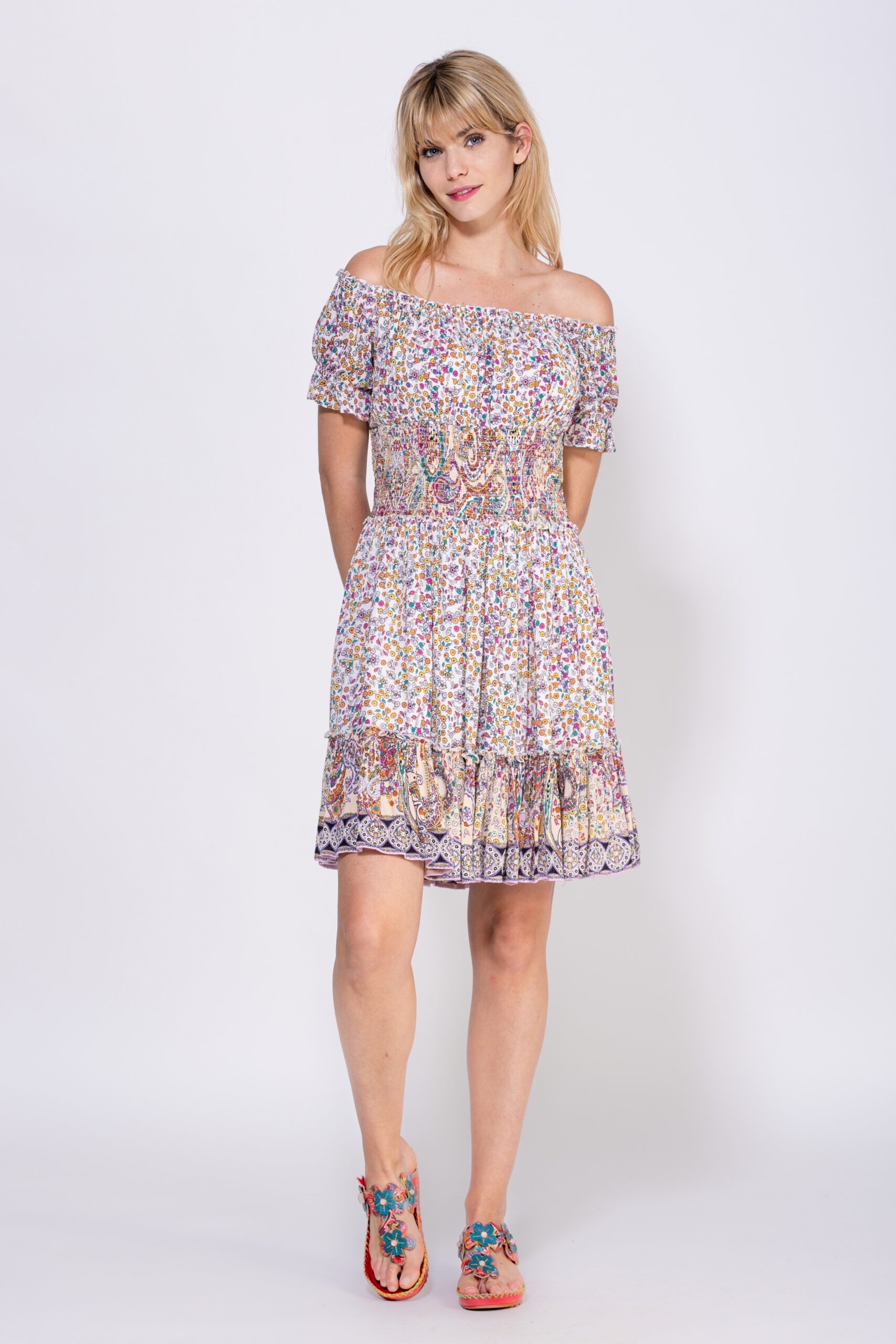 VESTIDO ESTAMPADO CORTO CON CUELLO ELASTICO PARA PONER SOBRE EL HOMBRO O SI SE PREFIERE EN PALABRA DE HONOR, MANGA CORTA, NIDO DE ABEJA EN CINTURA Y FALDA HASTA POR ENCIMA DE LA RODILLA, UN VESTIDO PARA TODO TIPO DE USO 100% VISCOSA