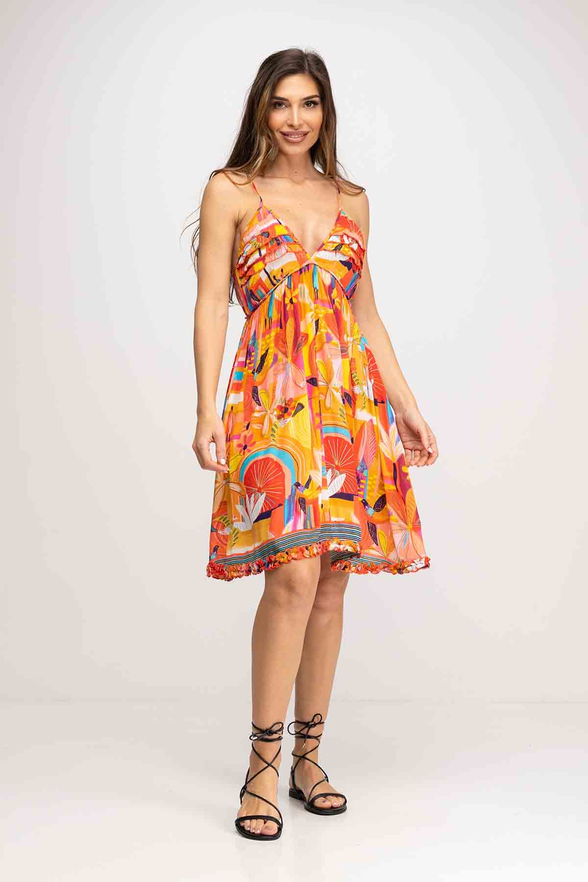 VESTIDO ESTAMPADO CORTO, TIRANTE ESPAGUETI ESCOTE EN V, DETALLE EN PECHO CON VOLANTES Y PEQUEÑO AGUJERO, CREMALLERA EN ESPALDA, CORTE BAJO EL PECHO, VOLANTE EN EL BAJO DE LA FALDA
