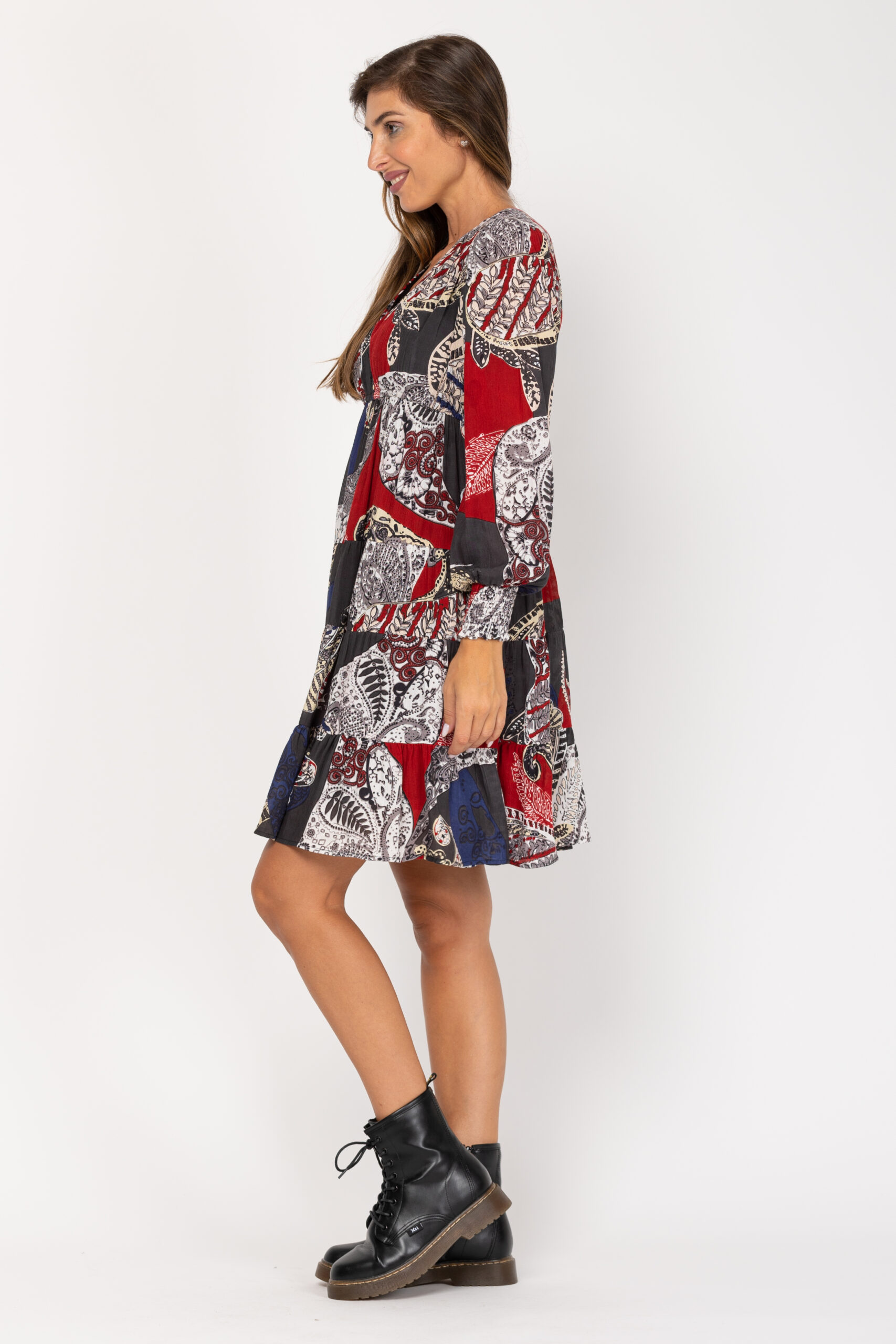 VESTIDO ESTAMPADO CON VARIOS CORTES GOMA BAJO PECHO PARA AJUSTAR CUELLO TERMINADO EN V MANGAS AMPLIAS TERMINADAS CON ELASTICO 100%VISCOSE