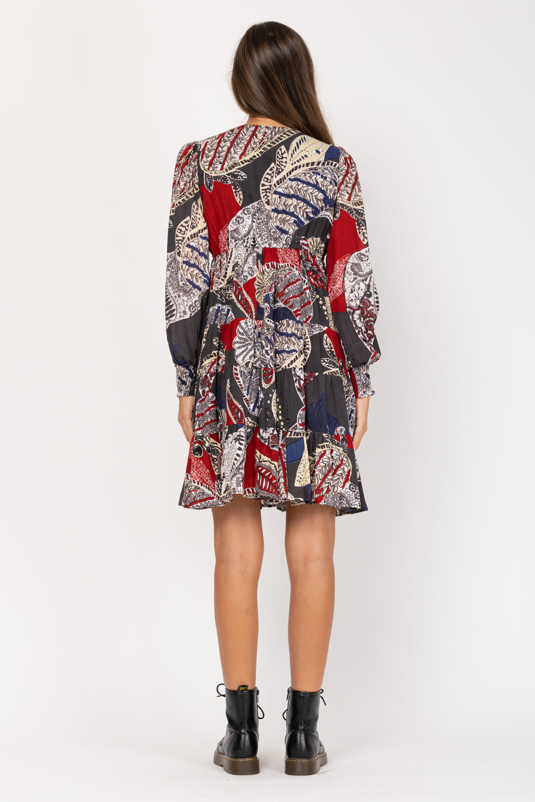 VESTIDO ESTAMPADO CON VARIOS CORTES GOMA BAJO PECHO PARA AJUSTAR CUELLO TERMINADO EN V MANGAS AMPLIAS TERMINADAS CON ELASTICO