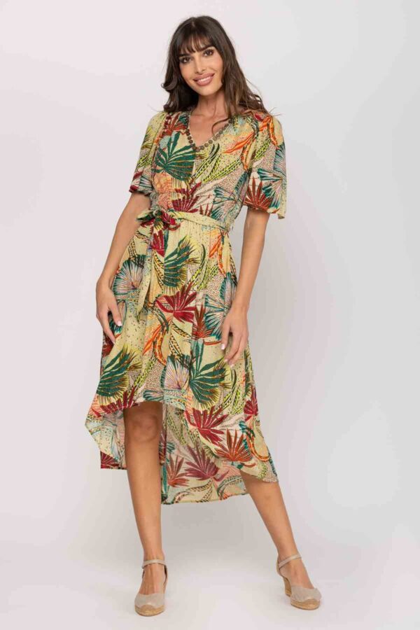 VESTIDO ESTAMPADO LARGO EN PARTE TRASERA Y A LA RODILLA EN DELANTERA, MEDIA MANGA, CUELLO EN V CON BOTONES DE COCO ALREDEDOR, CINTURA CON ELASTICO Y LAZO PARA AJUSTAR 100% VISCOSA
