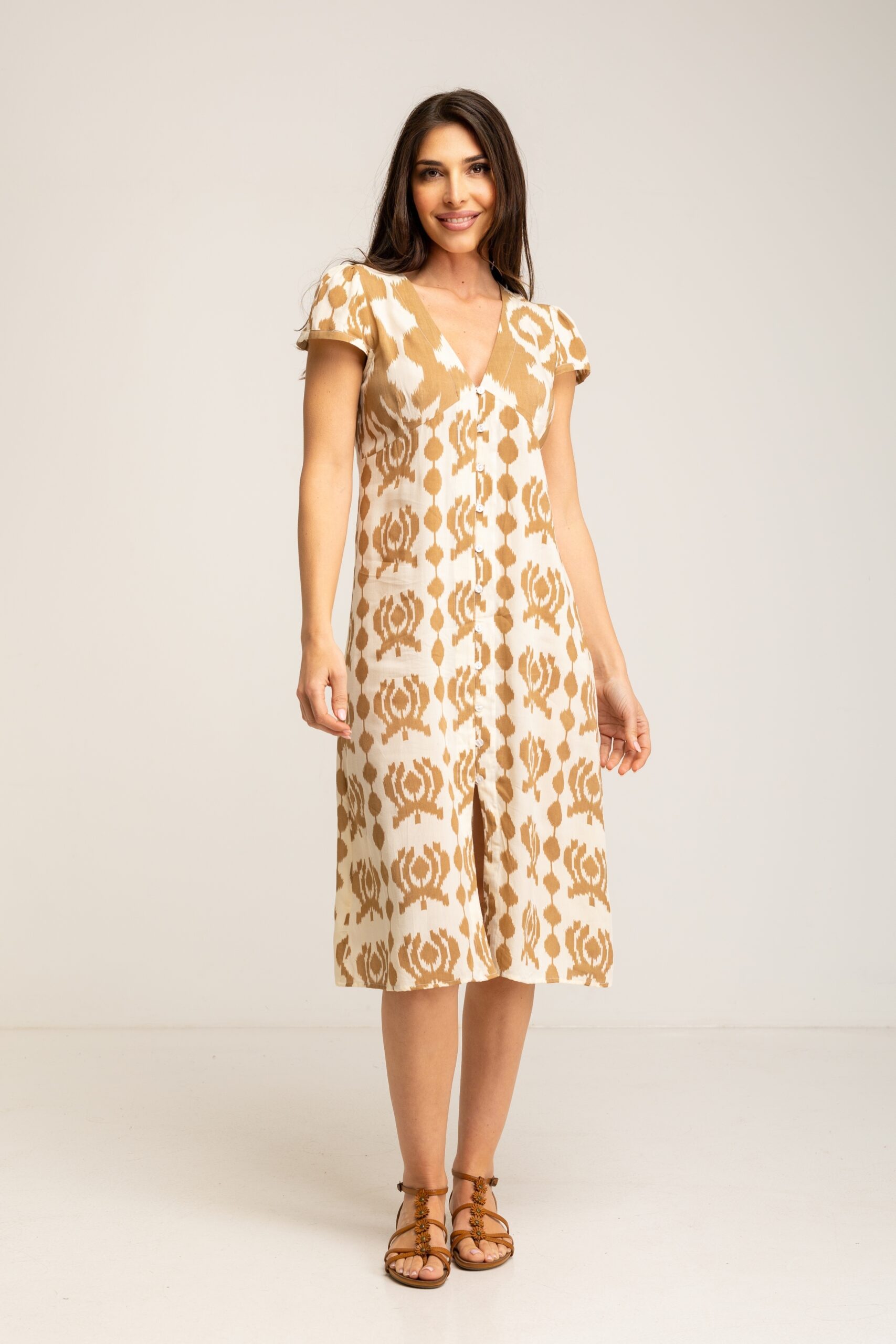 VESTIDO ESTAMPADO MONOCOLOR CUELLO EN V MANGA COPA Y ABOTONADO 100% VISCOSA