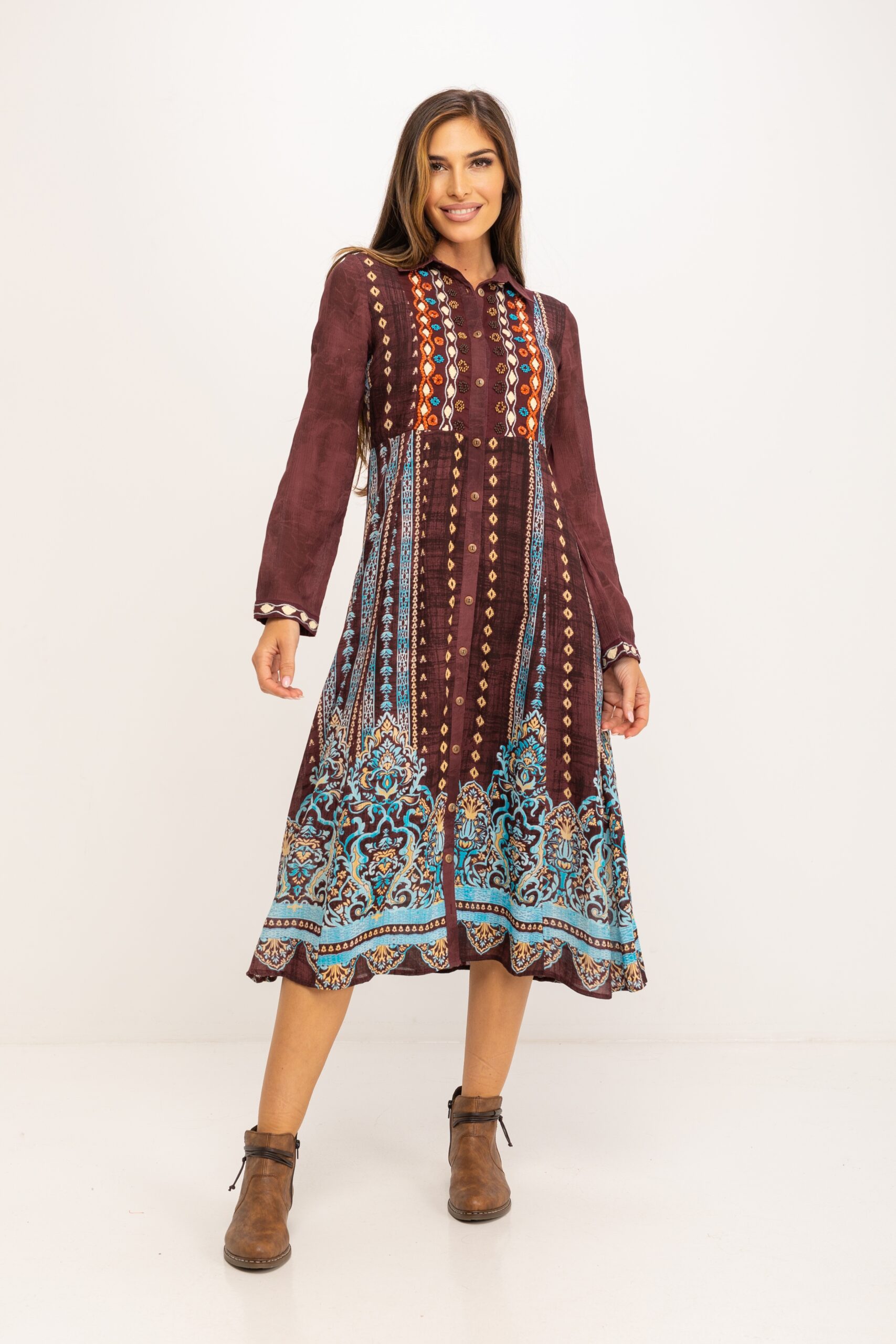 LONG OPEN DRESS WITH EMBROIDERED SHIRT COLLAR AND BEADS 100%VISCOSA