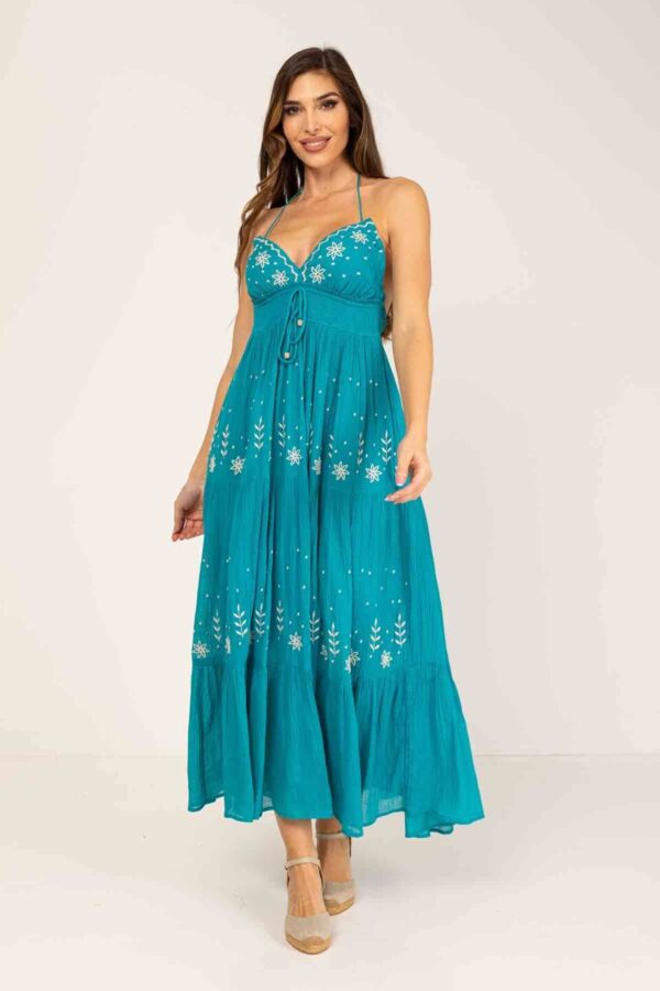 VESTIDO LARGO CON BORDADOS EN TEJIDO DE CREPE ALGODÓN, CON ESCOTE PICO ATADO AL CUELLO, ESPALDA ABIERTA Y AJUSTABLE DE NIDO DE ABEJA BAJO PECHO Y ESPALDA