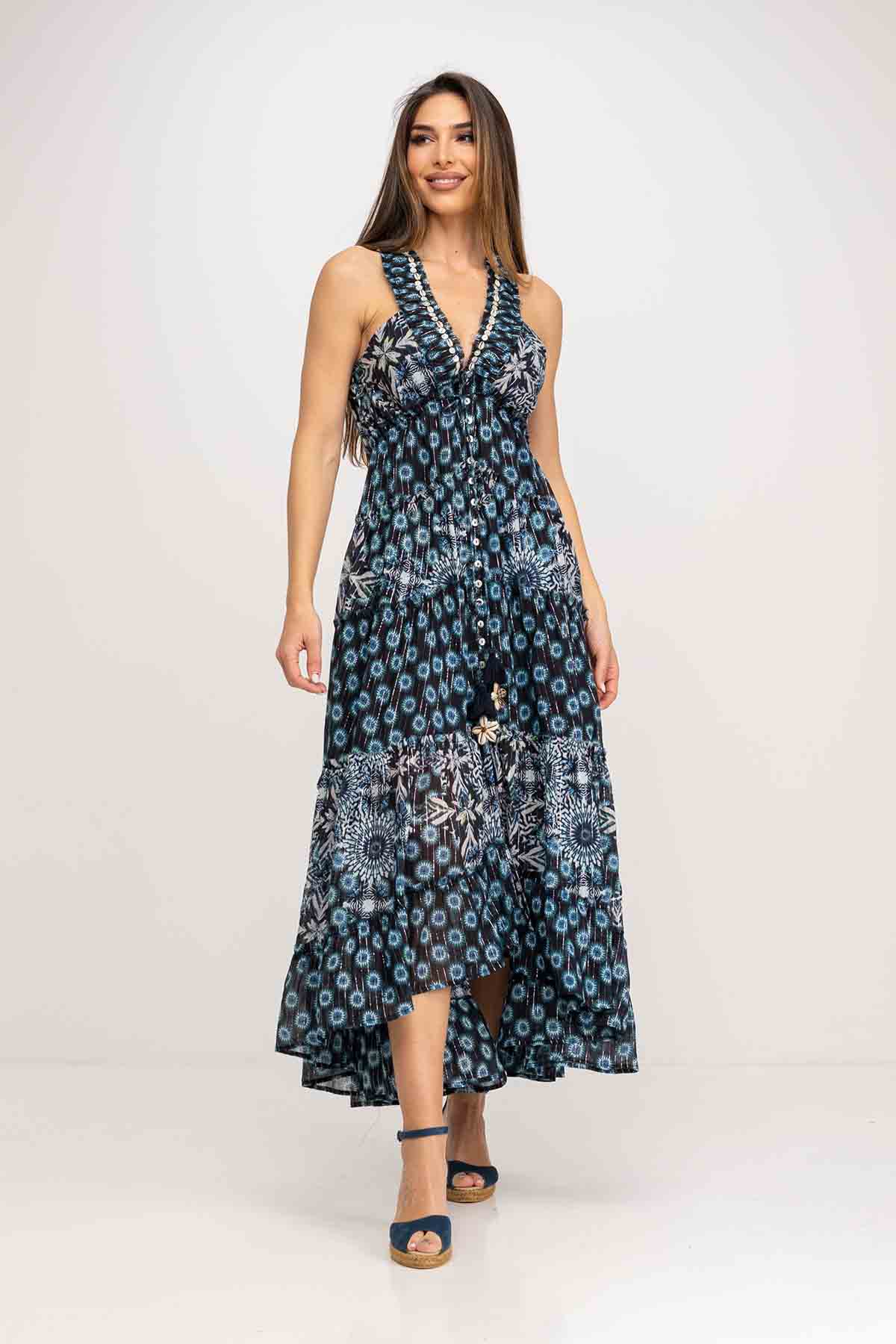 VESTIDO LARGO ESTAMPADO ABOTONADO CON CUELLO DE PICO CON ADORNO DE CONCHAS CORTE BAJO EL PECHO RECOGIDO CON CORDON