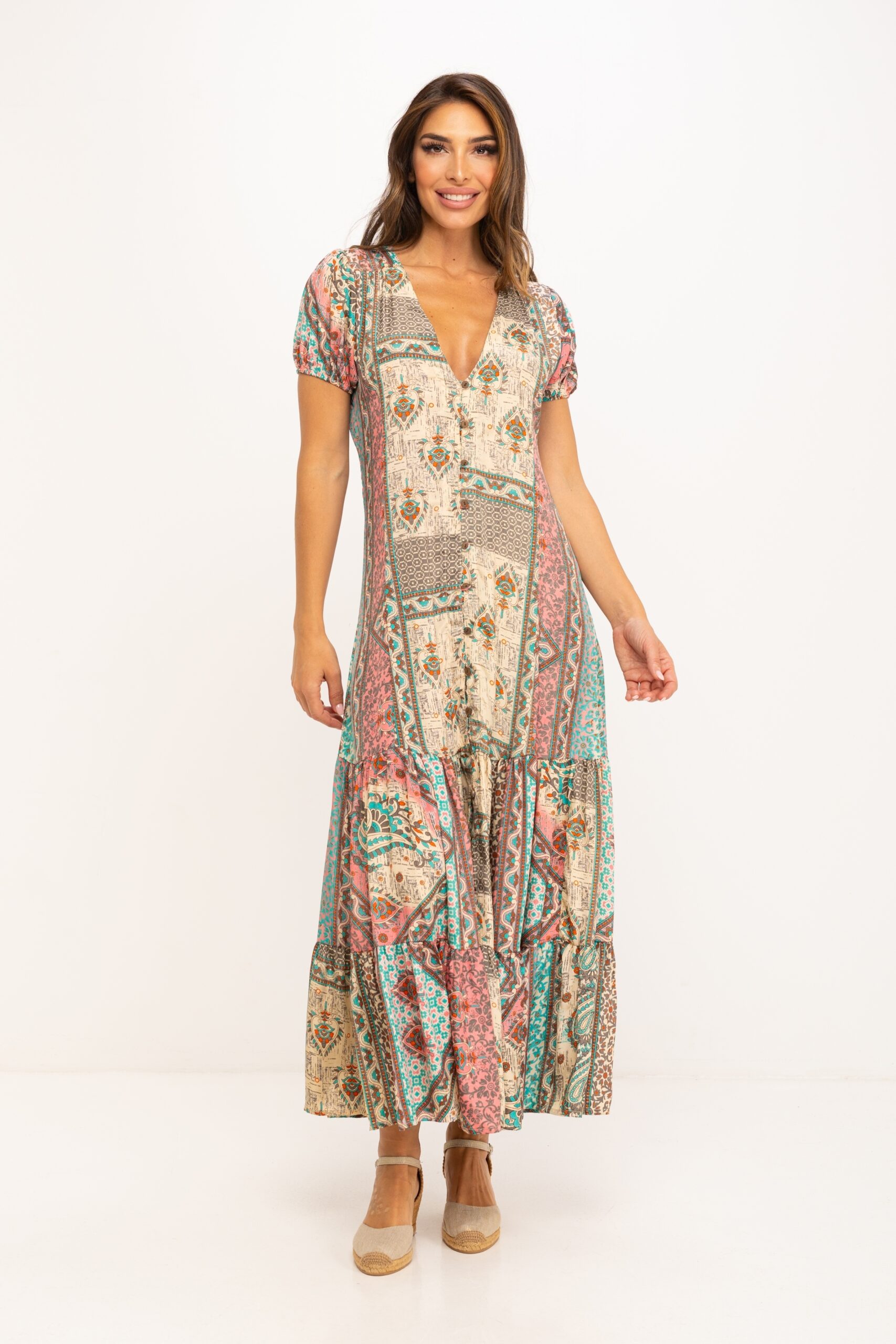 VESTIDO LARGO ESTAMPADO ABOTONADO CON ESCOTE EN V MANGAS TERMINADAS EN ELASTICO CON VARIOS CORTES