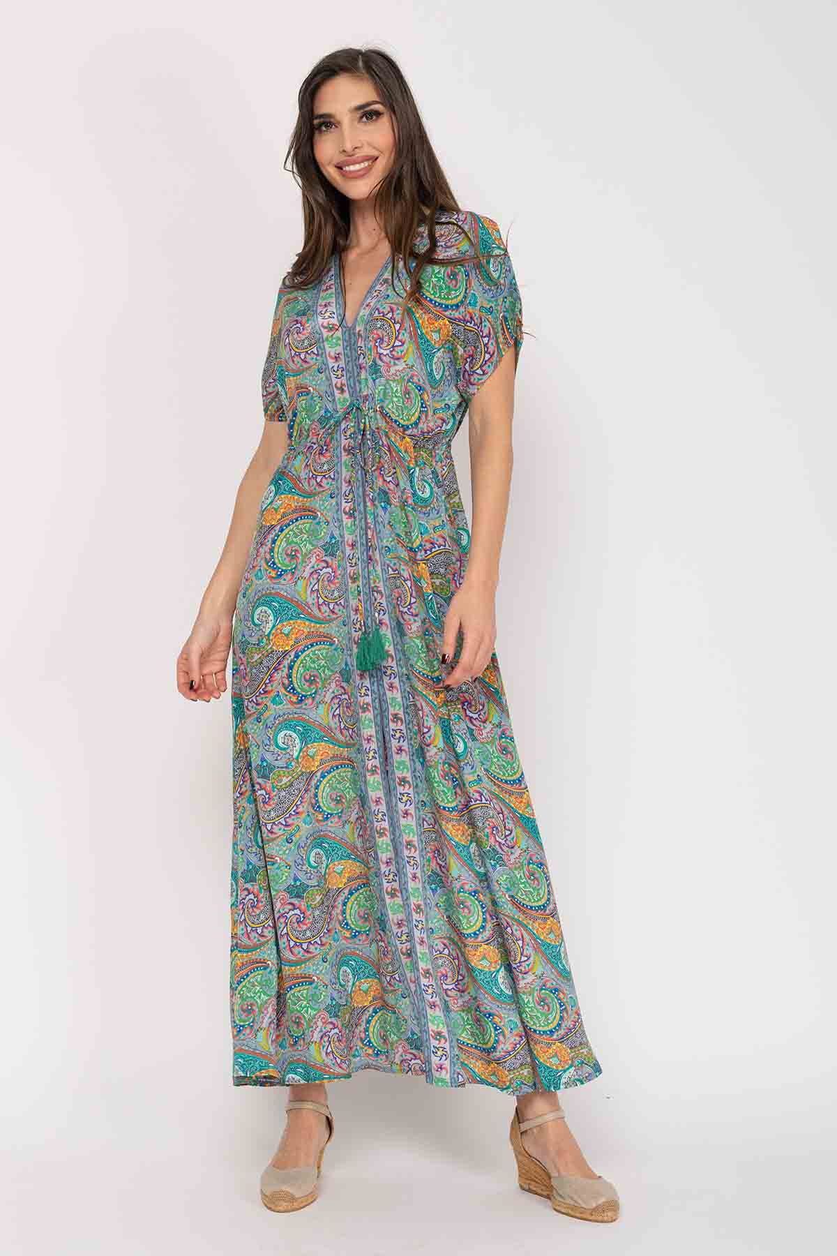 VESTIDO LARGO ESTAMPADO, CORTE BAJO EL PECHO, CUELLO EN V, ESPALDA ABIERTA CERRADA CON CORDON
