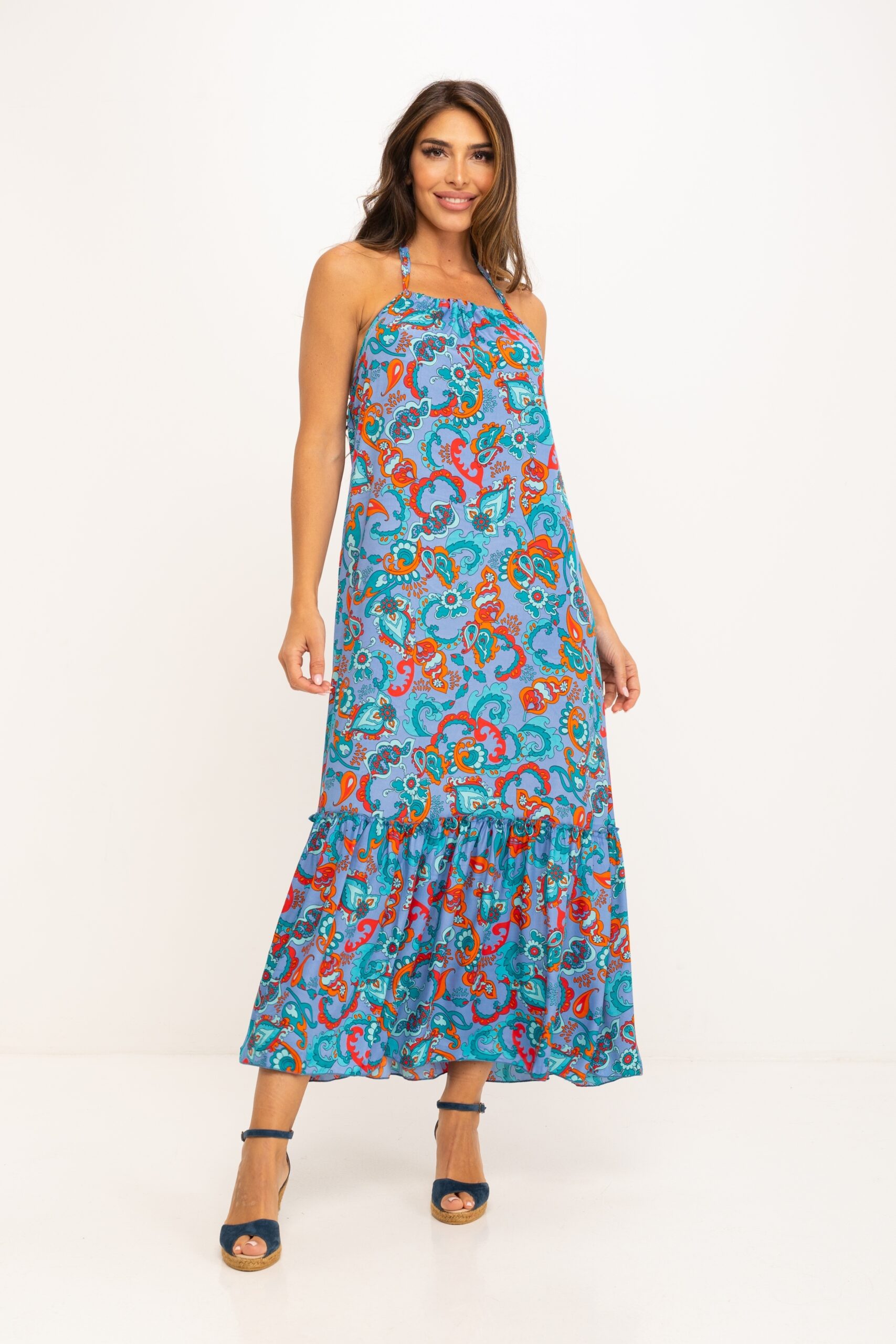 VESTIDO LARGO ESTAMPADO CORTE RECTO, ESCOTE RECTO SIN MANGAS CON UN TIRANTE CORREDERO AL CUELLO, EN BAJO CORTE A LA RODILLA PARA QUE AUMENTE EL VUELO DEL MISMO