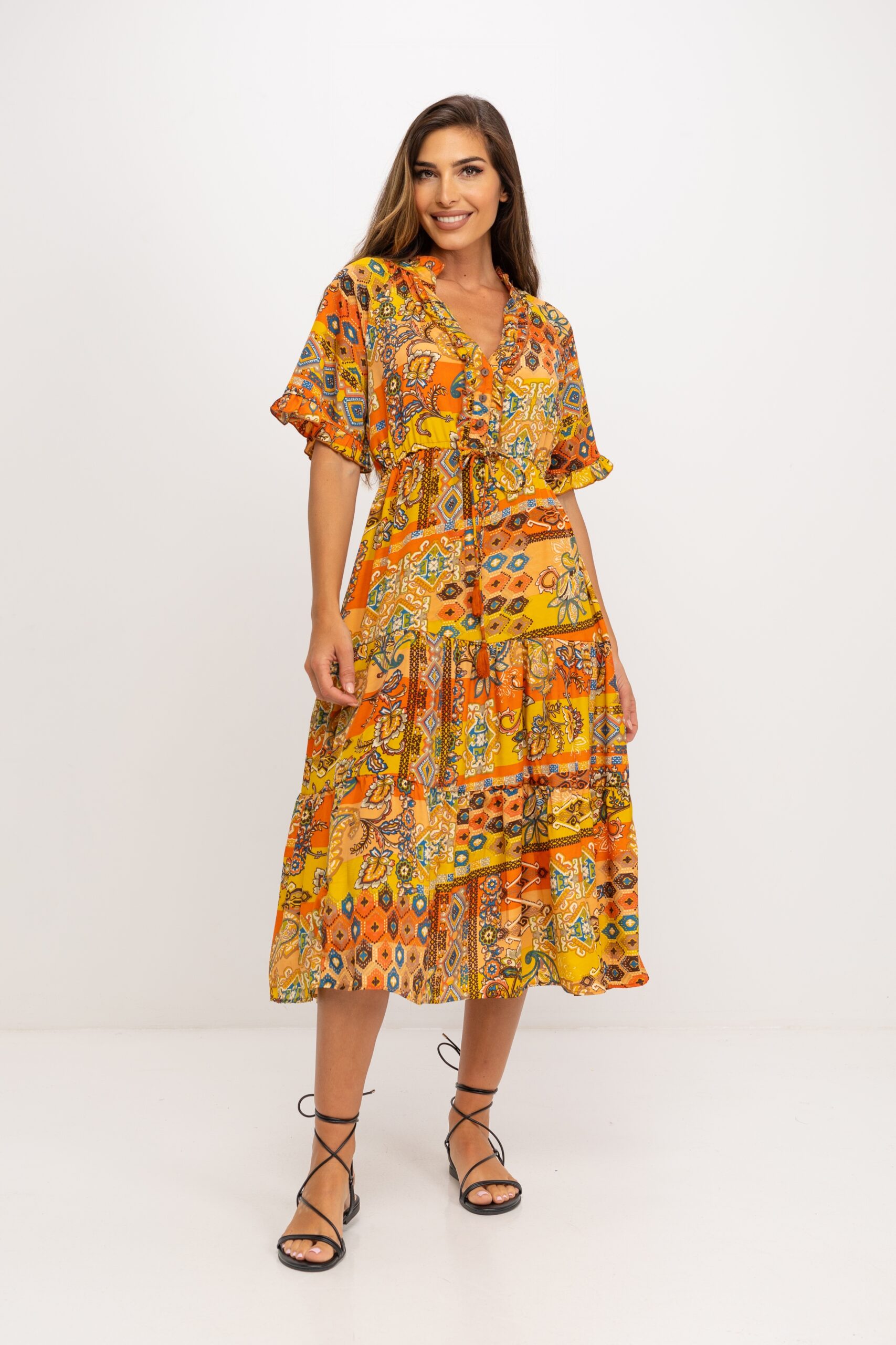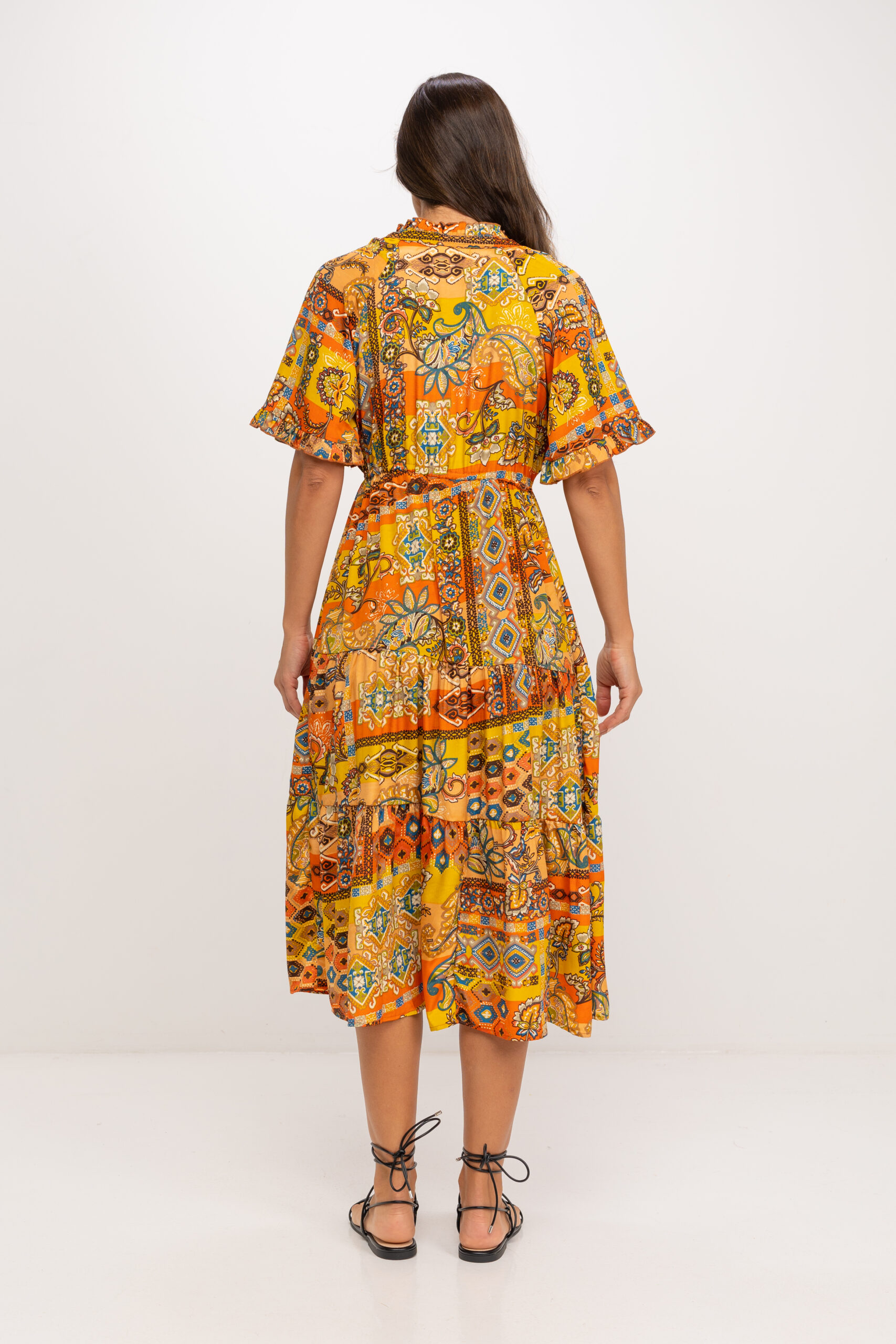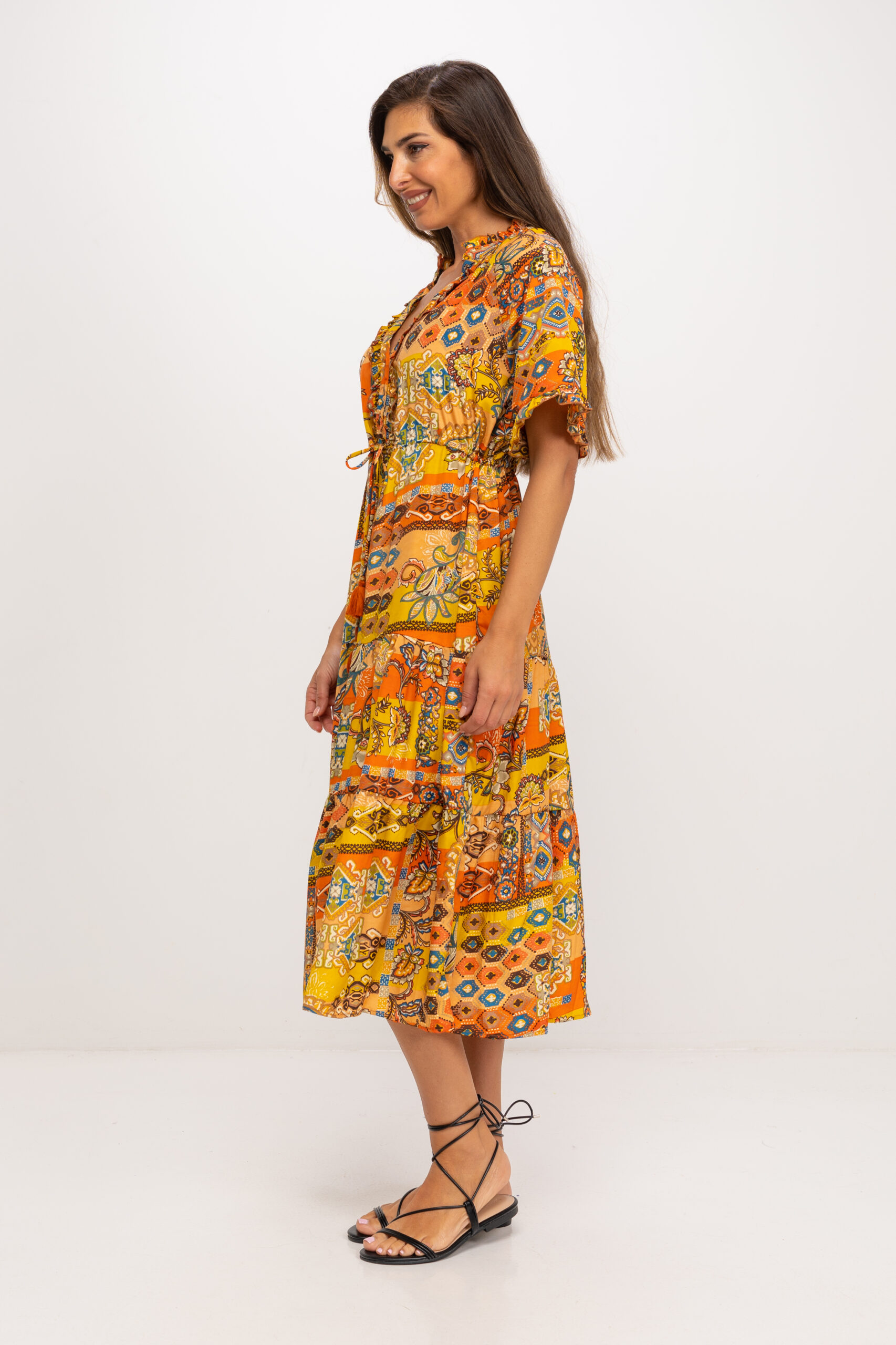 VESTIDO LARGO ESTAMPADO CUELLO MAO CON VOLANTE TERMINADO EN V ABOTONADO HASTA CORTE EN CINTURA DONDE SE AJUSTA CON CORDON 100% POLIESTER