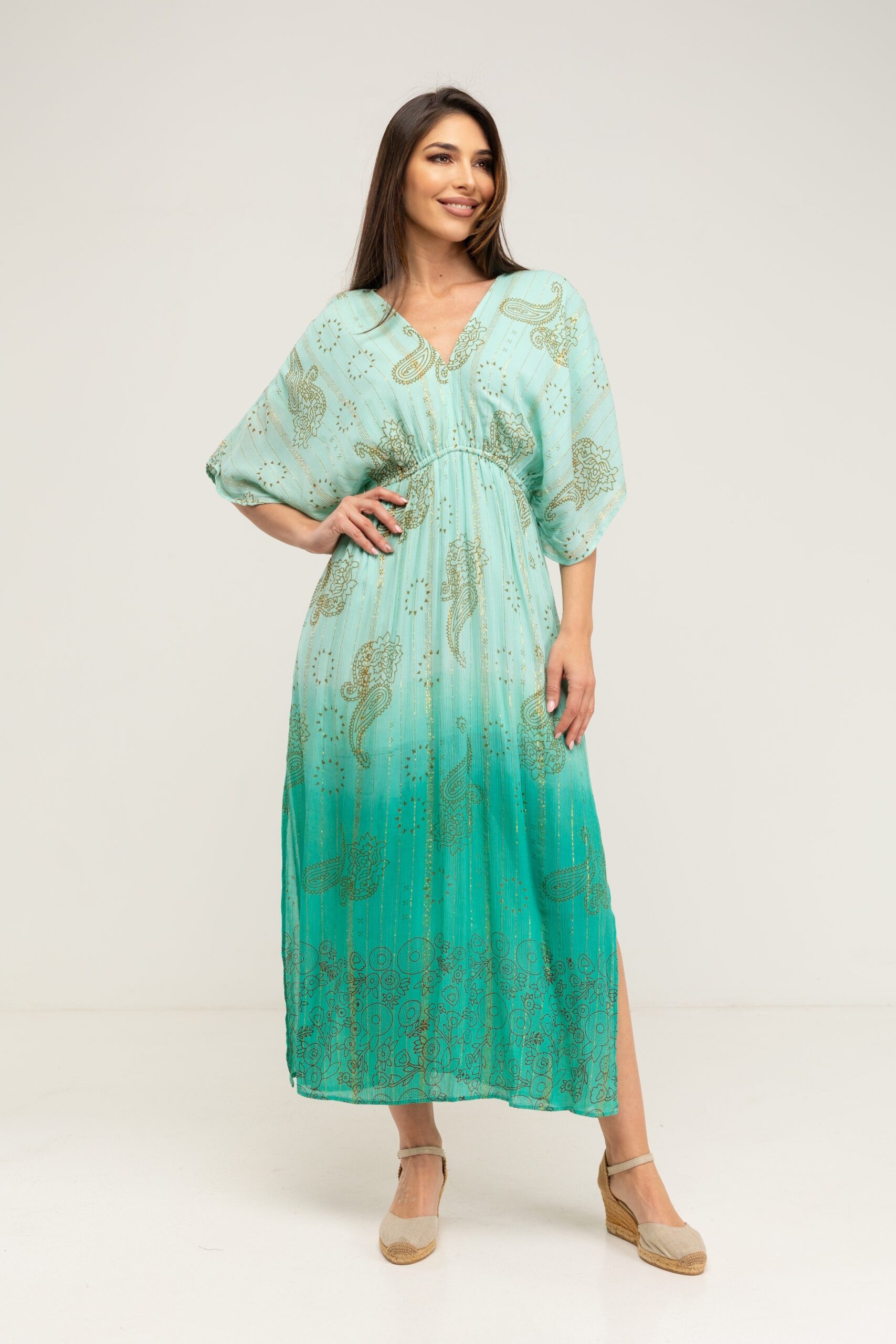 VESTIDO LARGO ESTAMPADO DORADO EN TEJIDO RUSTICO 90% VISCOSA 10% LUREX