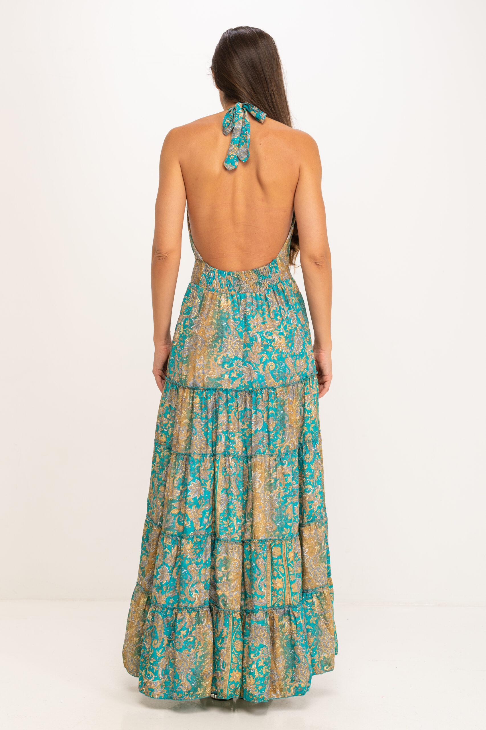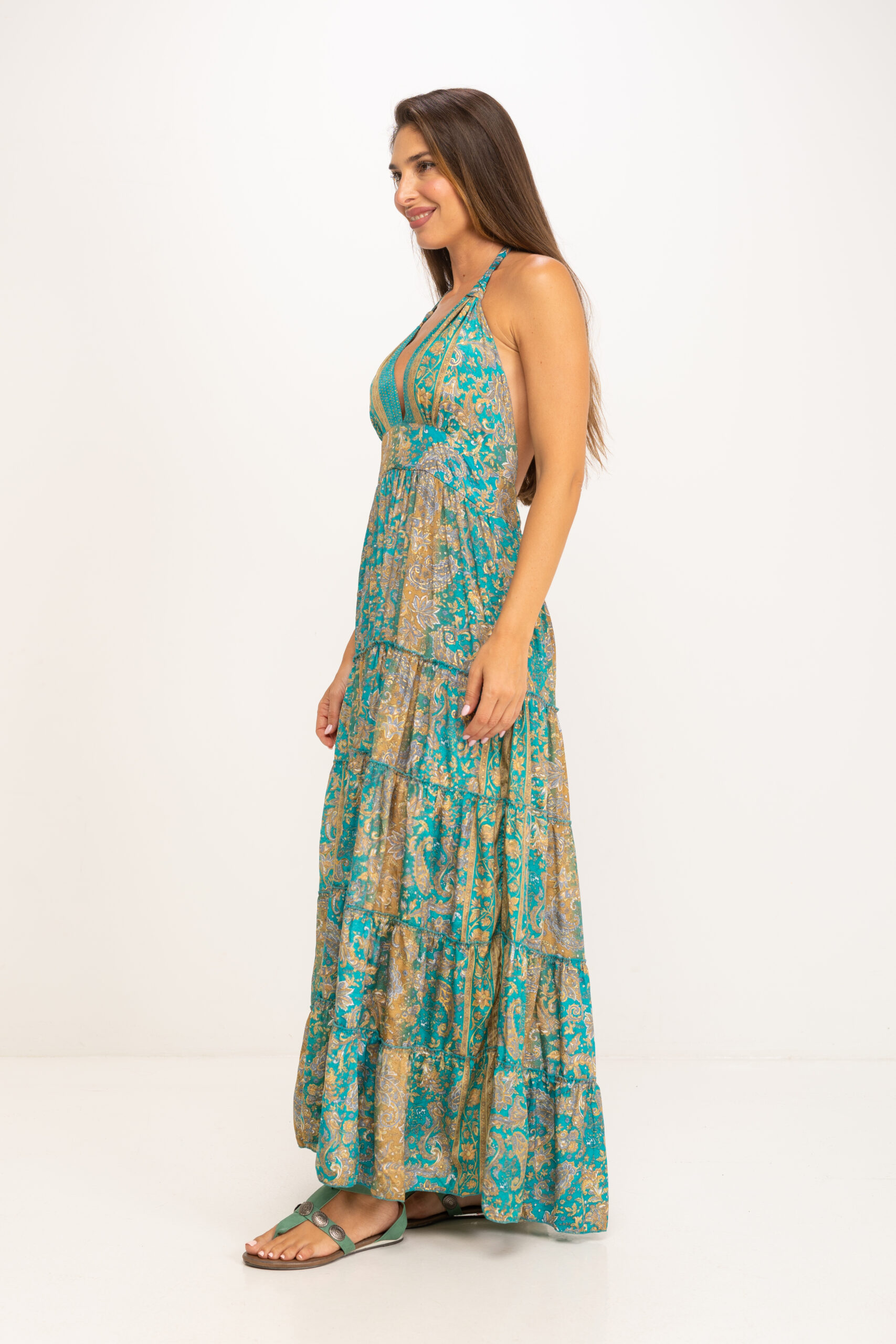 VESTIDO LARGO ESTAMPADO, TIRANTES AL CUELLO ESCOTE TIPO BIKINI DELANTERO ESPALDA, CORTE BAJO EL PECHO Y EN FALDA BAJO LA CADERA