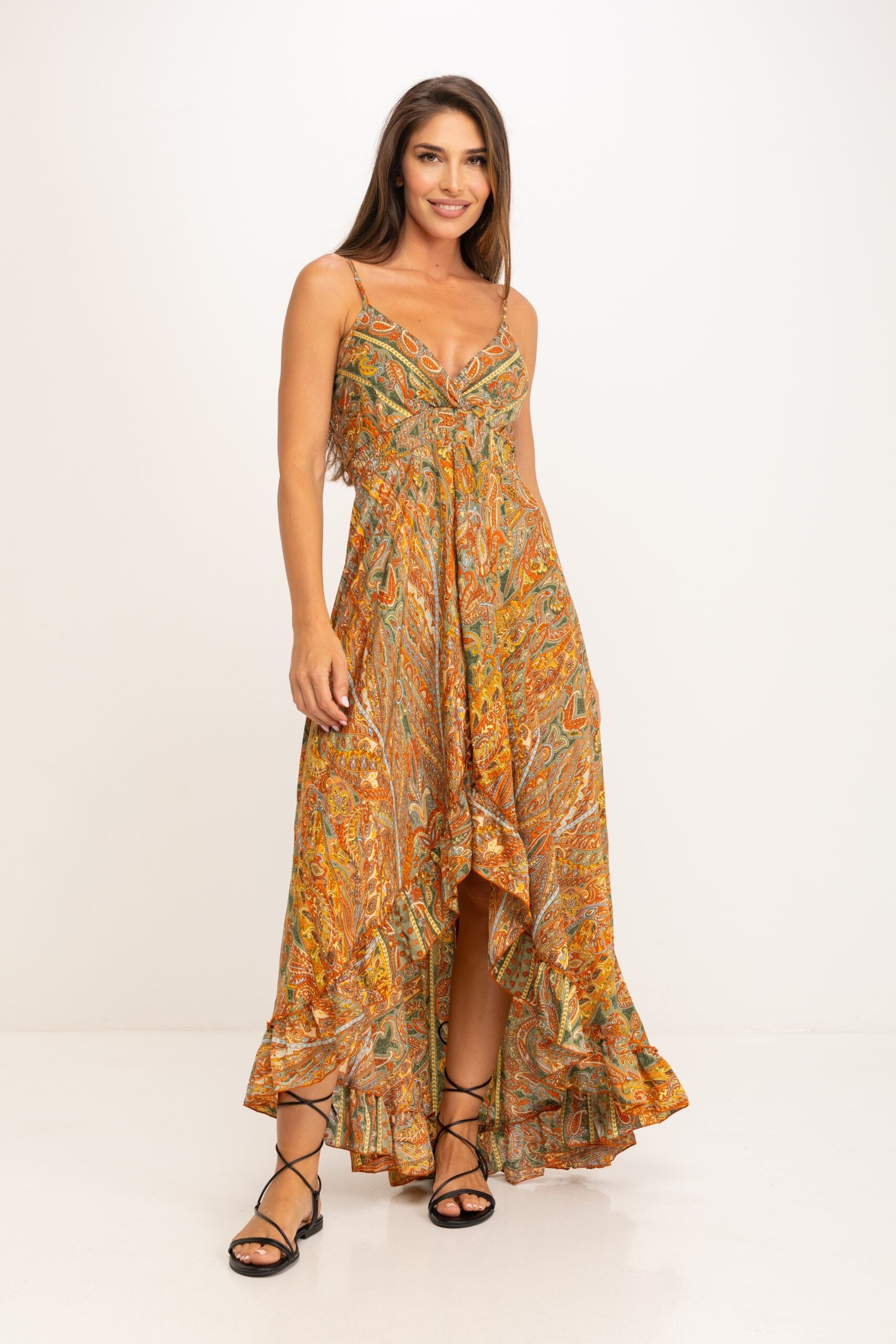 VESTIDO LARGO ESTAMPADO , TIRANTES ESPAGUETTI CON ESCOTE CRUZADO Y CORTE BAJO PECHO, BAJANDO SUELTO HASTA LLEGAR A UN BAJO CON ALTURAS DIFERENTES ENTRE PARTE DELANTERA Y TRASERA 100% POLIESTER